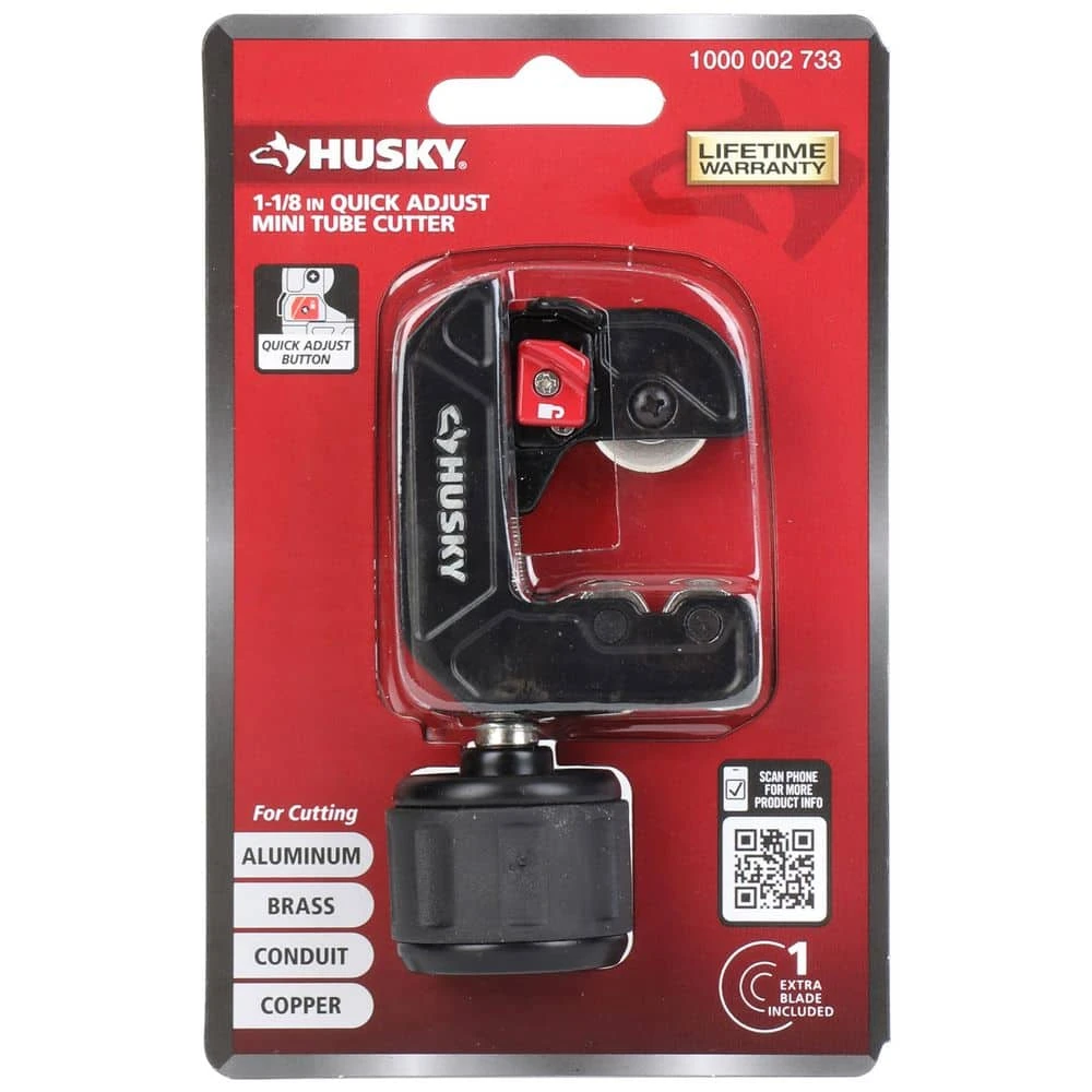 Use the Husky 1-1/8 in. Quick Release Mini Tube Cutter to make clean, square cuts on copper, brass, aluminum and thin-wall conduit. This tool features a convenient quick adjustment summary to facilitate fast size adjustments to various sizes of tubing. An extra blade is included and can be stored in the knob. Built to last and backed by the Husky lifetime warranty for satisfaction guaranteed.