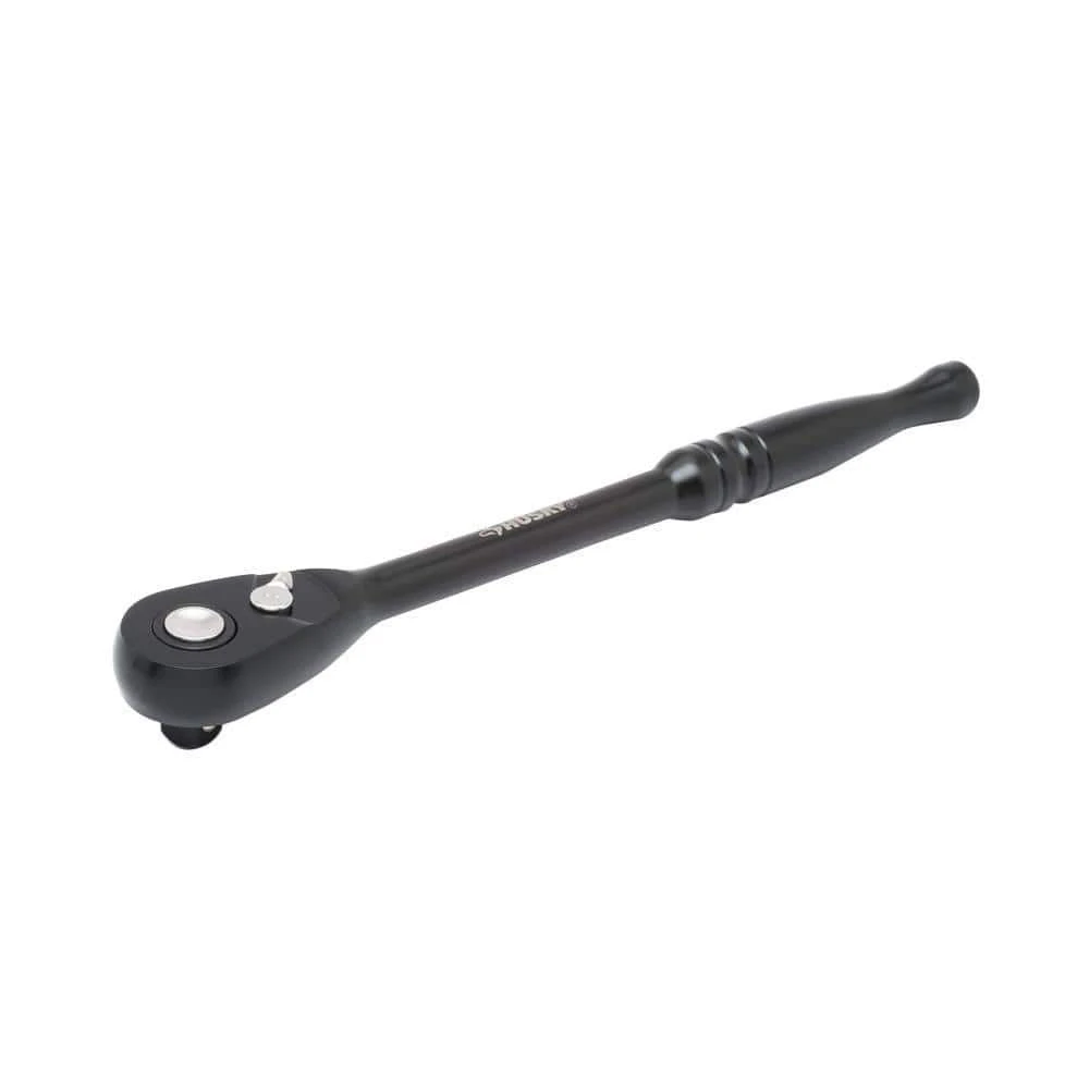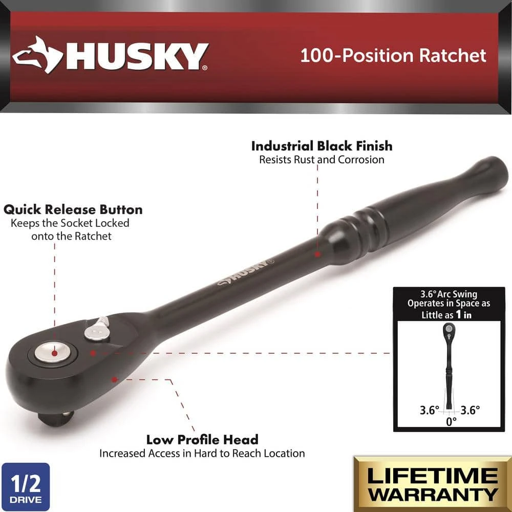 With a narrow arch swing of just 3.6 degrees, this Husky 100-Position 1/2 in. drive ratchet provides access to turn fasteners where other ratchets can’t. Supported by Dual-Pawl technology, its handle is 10 percent longer than others for an increased access to hard-to-reach fasteners, improving overall leverage. The industrial-grade black finish gives the tool a sleek look while adding durability and corrosion prevention.