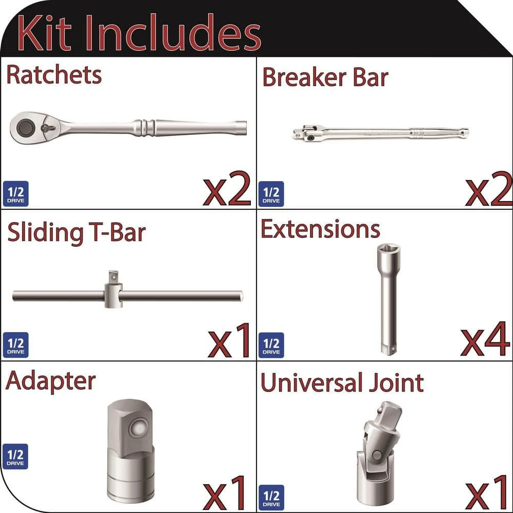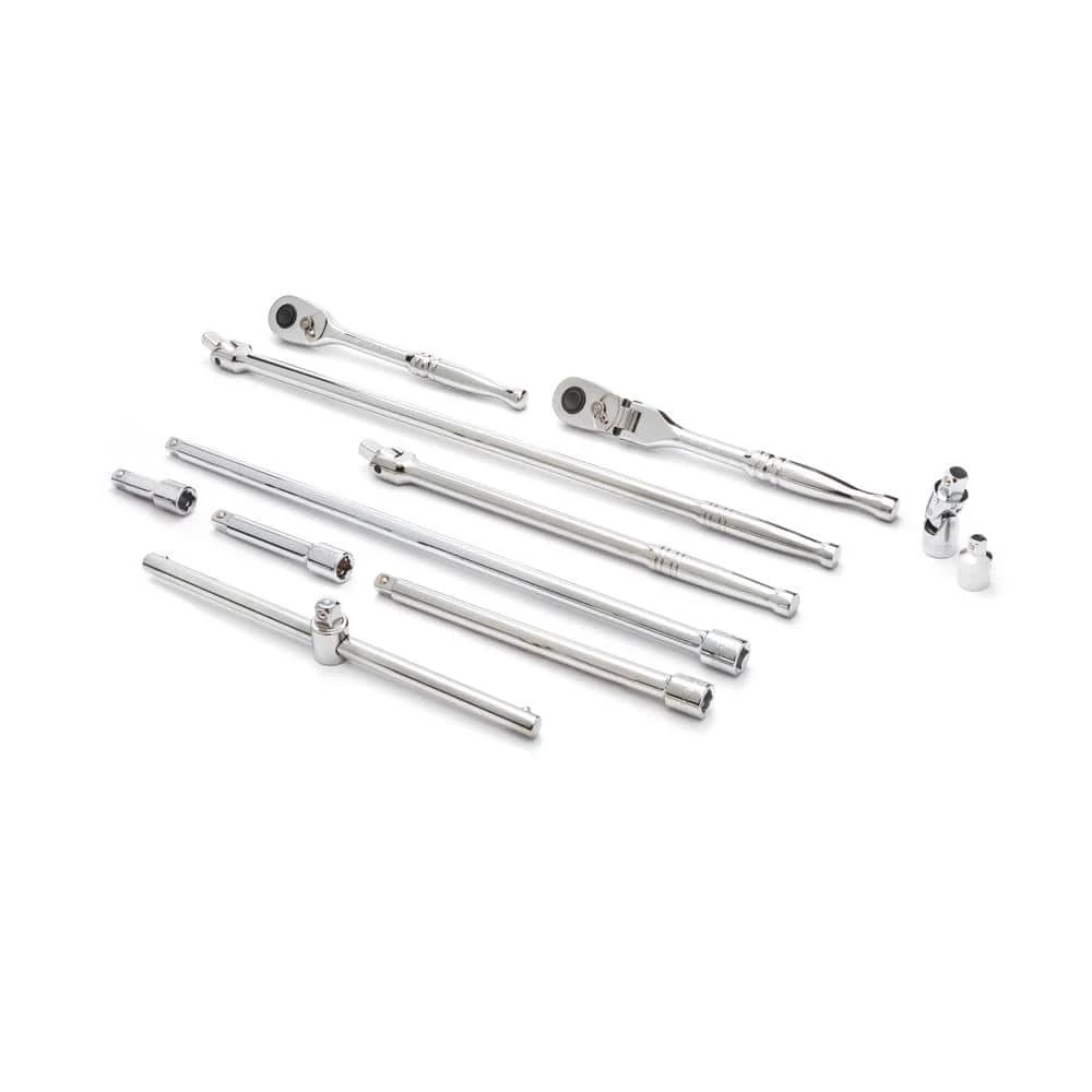The Husky 11-piece 1/2 in. drive Ratchet and Accessory set includes Ratchets, Extensions, U-Joints, and Adapters to complete any 1/2 in. drive socket set. This ratchet has a 1/2 in. drive and a teardrop-style head with a low profile to allow for excellent access to nuts and bolts in tight locations. The finish on all tool provides resistance to corrosion for a lifetime of use.