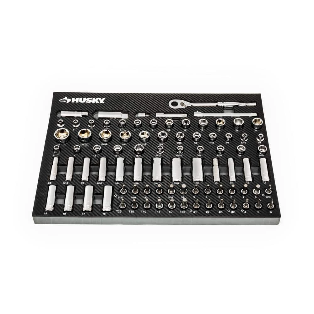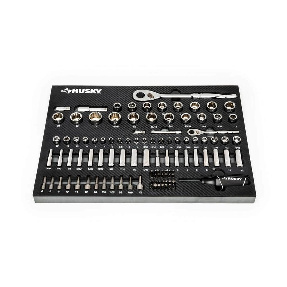 The Husky 72-tooth Full-Polish Ratchet is made of alloy steel to provide excellent durability. The finish provides resistance to corrosion. This ratchet has a teardrop-style head with a low profile to allow for excellent access to nuts and bolts in tight locations. This fully-encompassing set includes ratchets, standard and deep sockets, 6- and 12-point sockets, bit sockets, combination wrenches, hex keys, nut driver bits, adapters, extensions, spark plug sockets, and bit driver with bits. Comes in EVA foam, allowing for great organization in your garage or tool chest.