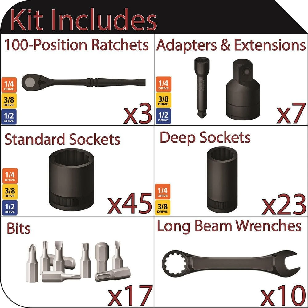 The dual-pawl technology of the 100-position ratchets in this Husky 105-piece universal mechanics tool set provides incredible access to bolts and fasteners where other ratchets simply can’t. The standard and deep knurl grip universal sockets work on 6 different styles of fasteners, making this the ultimate socket set for any job. This Husky set is perfect for professional mechanics or the DIYer working around the house or in the garage needing access to hard-to-reach fasteners.