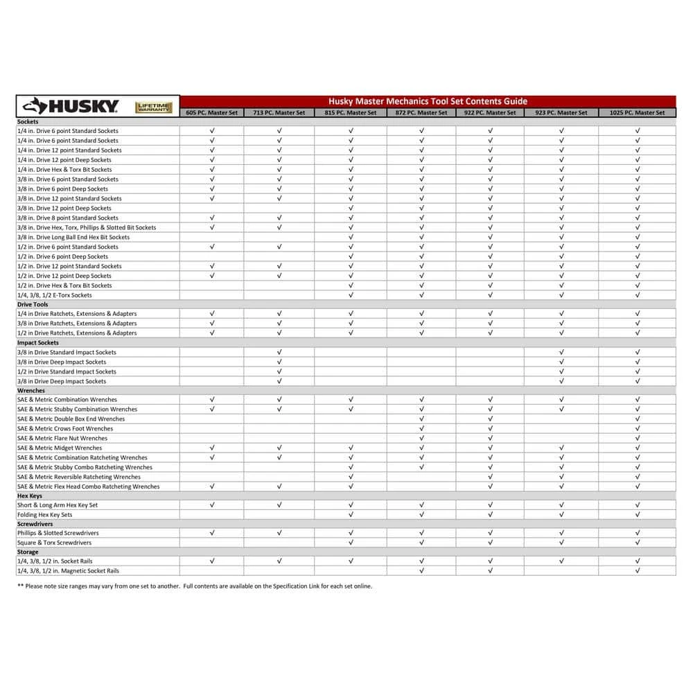 Always have the right tool for the job with this Husky Master Mechanics Tool Set. This 922-piece set has most of the tools a mechanic needs. A versatile set that is all you will need to get the job done.