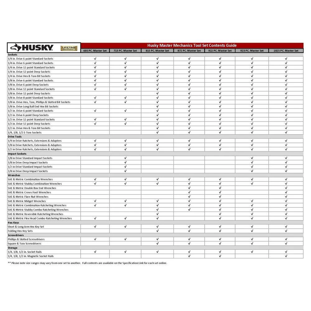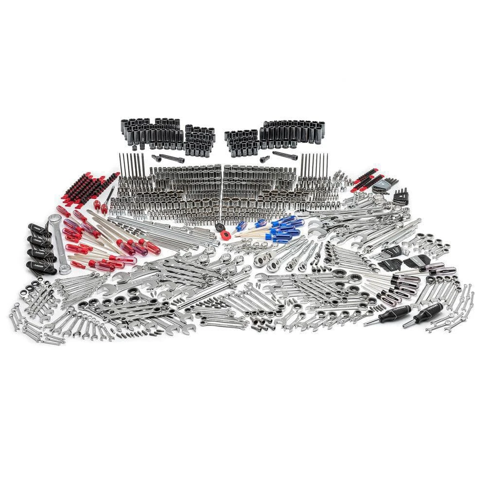 Always have the right tool for the job with this Husky Master Mechanics Tool Set. The set contains 923-pieces and has most of all the tools a mechanic needs. It includes 433 chrome and 101 impact sockets in the most-used drive in. sizes and 145 wrenches including standard combination, ratcheting, flex head ratcheting and specialty. The 13 drive tools, 22 extensions and adapters, and 33 screwdrivers let you spend more time on repairs and less time searching for tools.