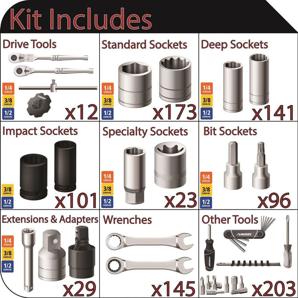- Included sockets: (122) 1/4 in. drive sockets, (209) 3/8 in. drive sockets, (203) 1/2 in. drive sockets