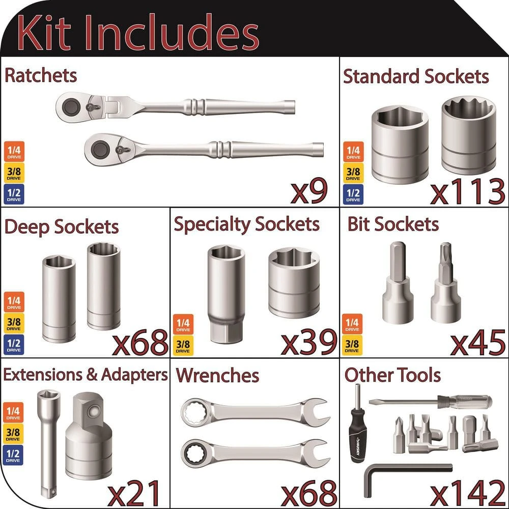 Always have the right tool for the job with this Husky Master Mechanics Tool Set. The set contains 505-pieces and has most of all the tools a mechanic needs. 9 Drive tools, 113 standard sockets, 68 deep sockets, 84 specialty sockets, 21 adapters and extensions, 48 wrenches, and 162 other tools such as hex keys, screwdrivers, bits, etc. Sockets included in the most-used drive-inch sizes and wrenches including standard combination, ratcheting, flex head ratcheting and specialty. An array of drive tools, extensions, adapters and screwdrivers let you spend more time on repairs and less time searching for tools. For a complete listing of tools included in this tool set, refer to the specification document in the info and guides section.