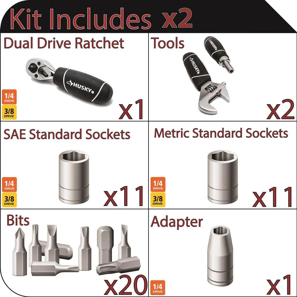 This 2-pack of Husky 46-Piece Stubby Ratchet Sets includes 44 sockets and 40 screwdriver bits to handle various jobs around the house. The stubby ratchet features a 1/4 in. drive tang on one side and 3/8 in. drive tang on the opposite side, giving you the versatility to use both drive sizes on one ratchet. The 72-tooth stubby ratchet needs only a 5° swing arc to turn a fastener, allowing you to work in tight places. Co-molded grips on the ratchet, ratcheting bit driver, and adjustable wrench provide a strong and comfortable grip to get the job done. The magnetic bit driver works with all standard 1/4 in. drive bits. Sets are kept organized and travel-ready in plastic storage cases marked with each size.