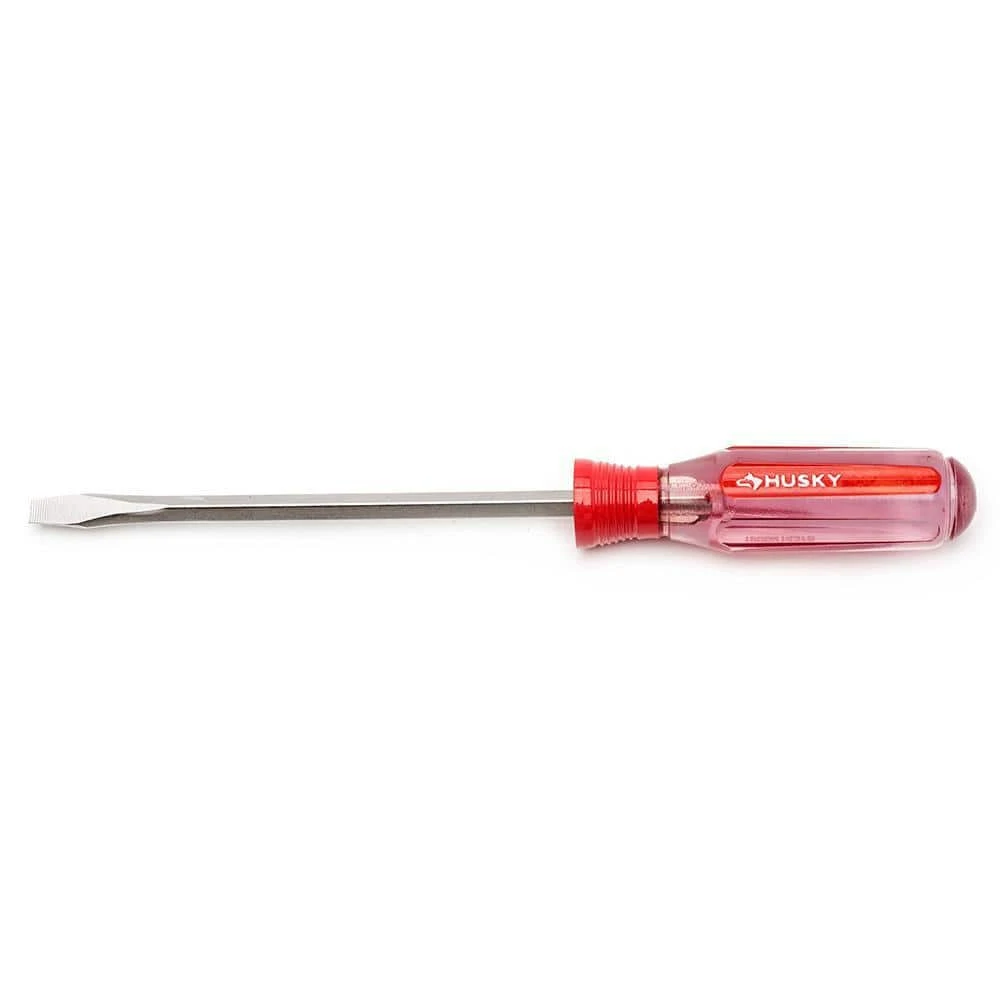 The Husky 1/4 in. x 6 in. Square Shaft Standard Slotted Screwdriver features an impact and chemical resistant acetate handle. The forged steel blade is chrome plated for added corrosion resistance. The slotted tip is serrated which provides increased grip and reduces slipping to better avoid fastener rounding.