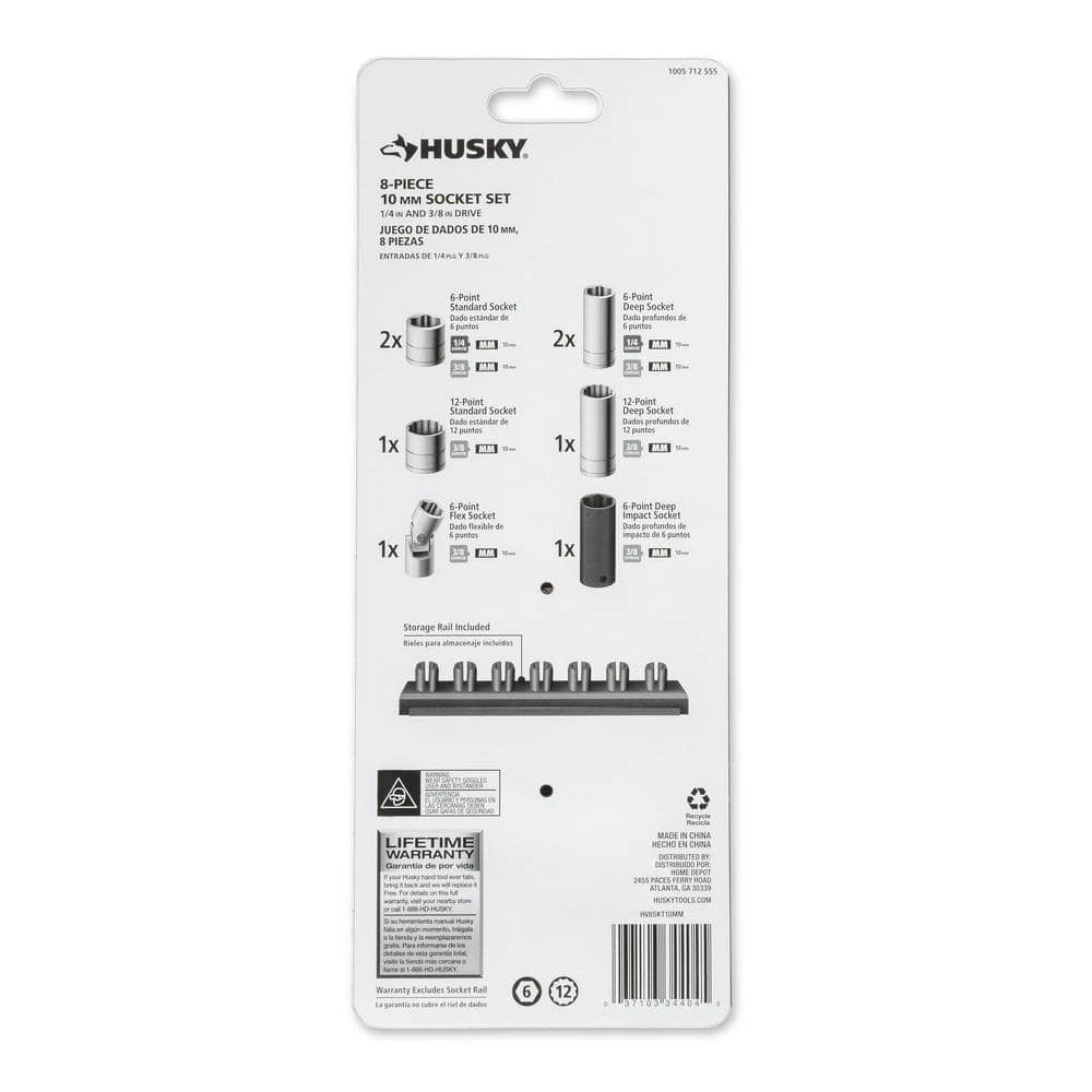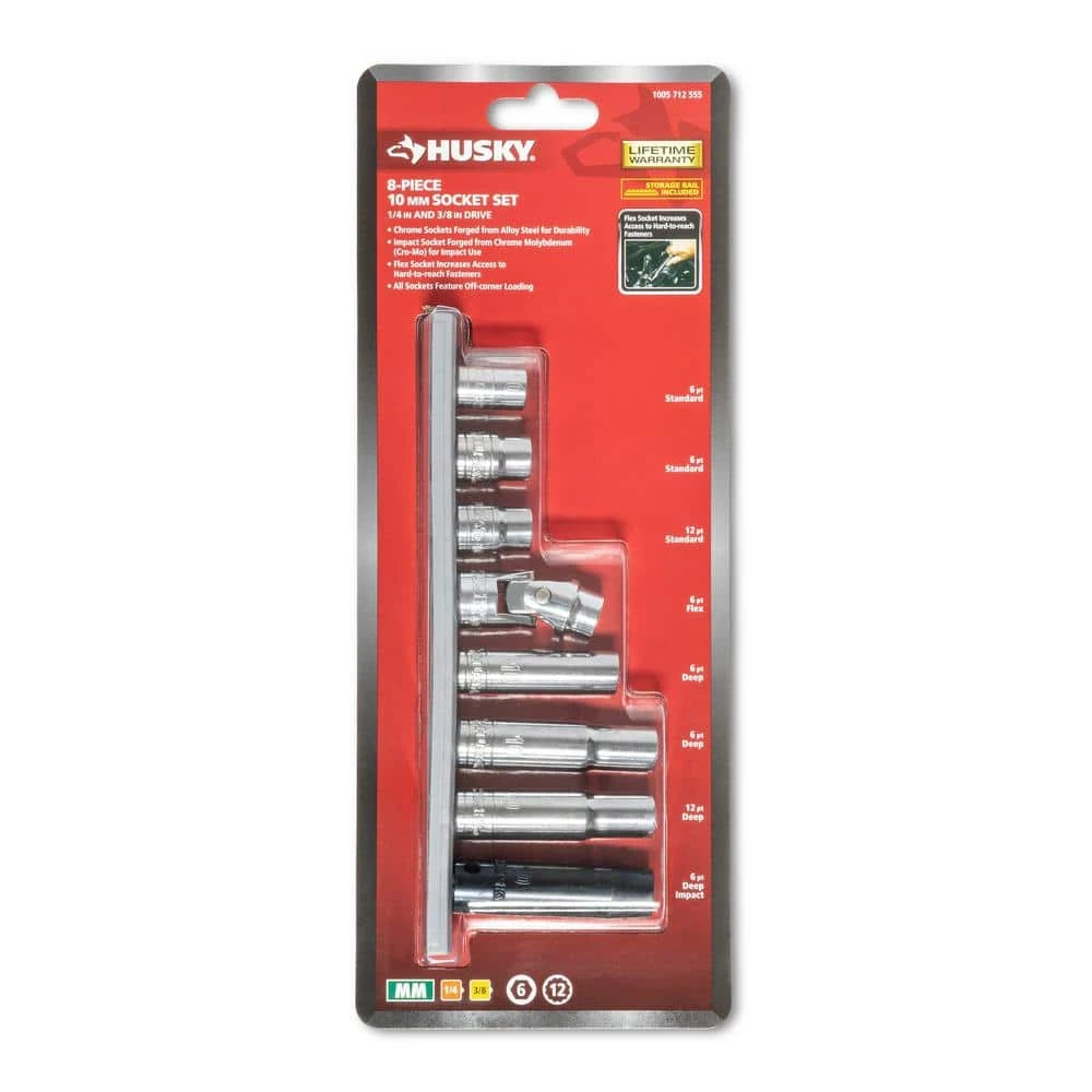 - Set includes eight 10 mm sockets: two 1/4 in. drive sockets (one 6-point standard socket, one 6-point deep socket) and six 3/8 in. drive sockets (one 6-point standard socket, one 6-point deep socket, one 6-point flex socket, one 12-point standard socket, one 12-point deep socket, one 6-point deep impact socket)