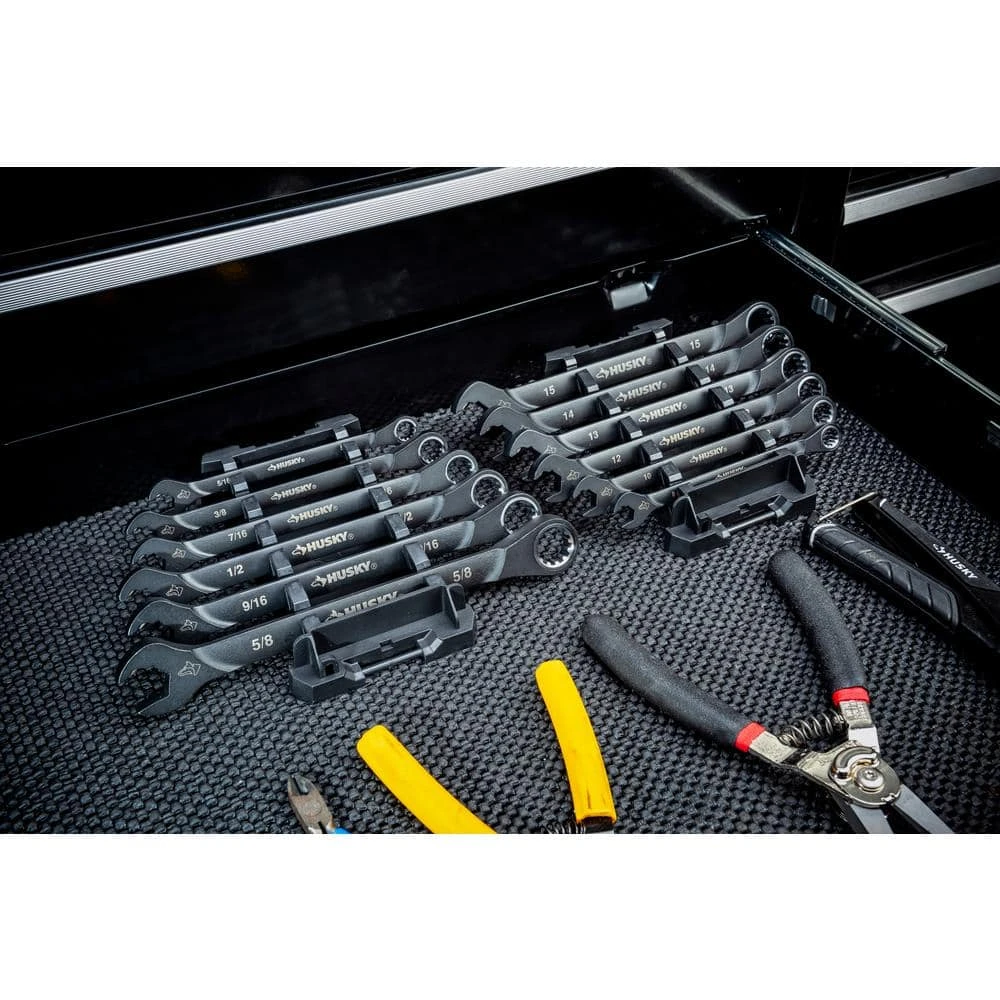 The dual-pawl technology on the Husky 100-Position Double Ratcheting SAE Wrench Set provides access to engage fasteners where other wrenches can’t with its ultra-narrow, 3.6° swing arc box end. Its 10% longer beam provides increased reach for accessing hard-to-reach fasteners and improves overall leverage. The innovative open-end ratcheting design improves the speed of ratcheting and allows access of an open end without ever removing the wrench from the fastener.