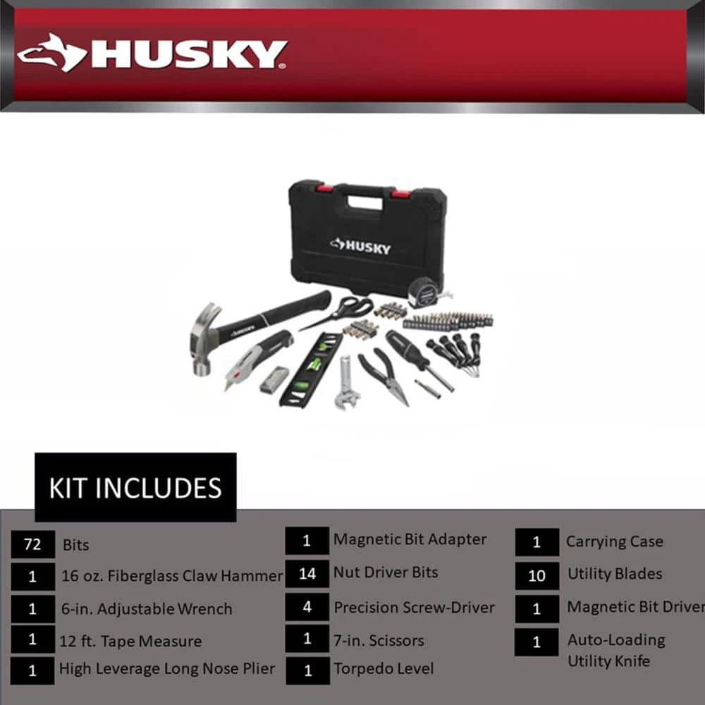 The Husky 110-piece Homeowner’s Set includes a versatile assortment of tools for completing your household projects and tasks. This set includes screwdrivers equipped with 72-piece bits; 16 oz. Fiberglass Claw Hammer, 9-in. Torpedo Level, 6-in. Adjustable Wrench, Auto-Loading Utility Knife, 12-ft tape measure, 7-in. Scissor, 6-in. High Leverage Long Nose Pliers, Precision Screw Drivers, Magnetic Bit Driver, Utility Blades, Magnetic Extension Bit Adapter, 72 Bits, 14 Nut Driver Bits and a storage carrying case. Auto-loading utility knife provides a comfortable grip. This Husky tool set is a perfect solution in having the tools you need in a convenient carrying case.