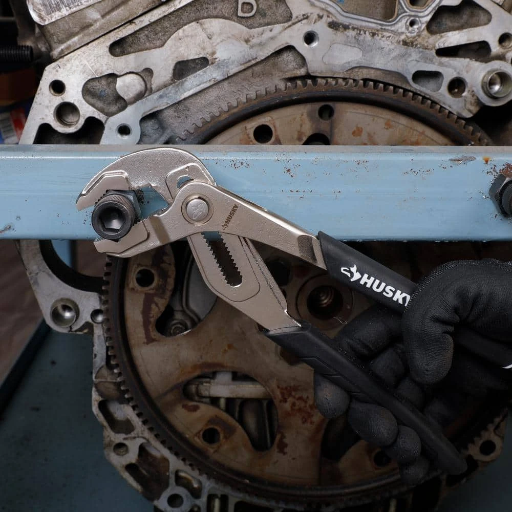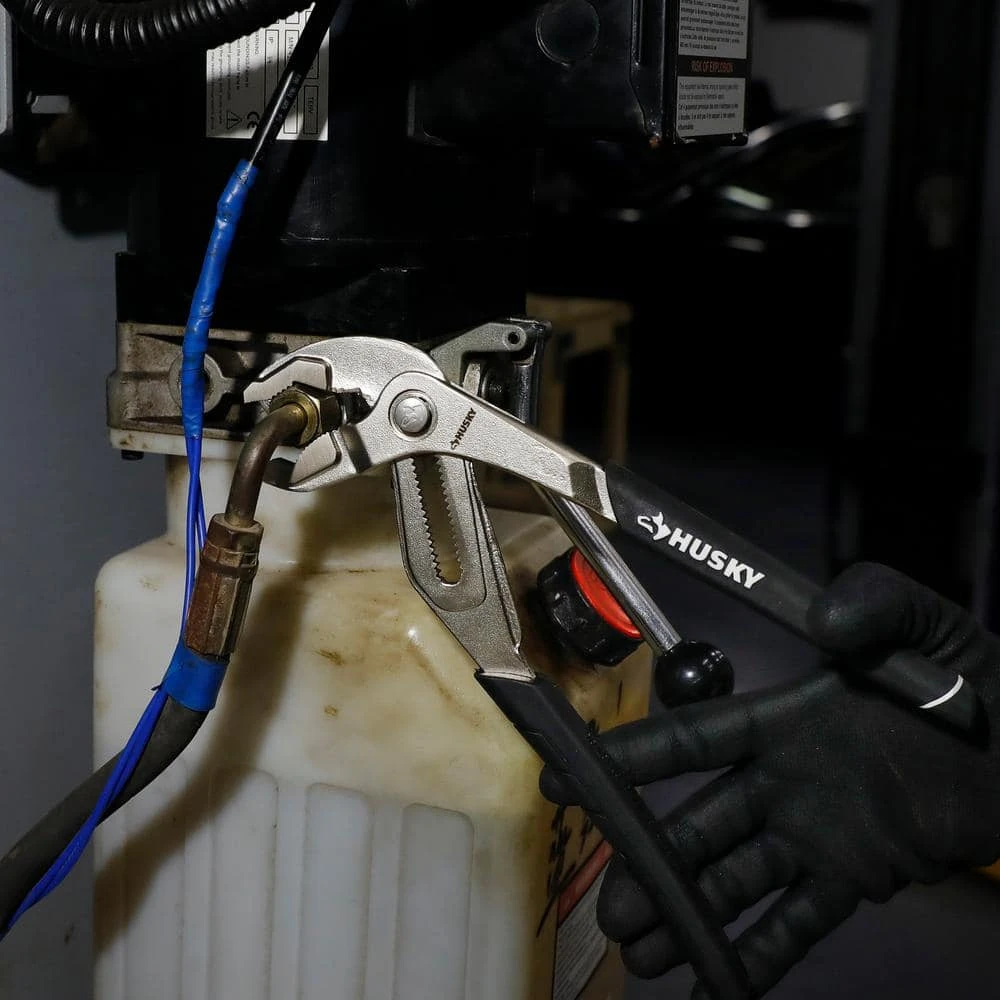 The 12 in. Husky Groove Joint Pliers also known as tongue and groove pliers are often used for gripping irregularly shaped objects. They can also be used for clamping materials, commonly used for turning and holding nuts and bolts. An advantage to this design of pliers is that it can adjust to a number of sizes without the distance in the handle growing wider. At the touch of a summary, the jaws can be moved to quickly fit a fastener without having to guess which the appropriate groove to use for size is. These pliers generally have long handles for increased leverage. Rubberized handles provide for a comfortable, non-slip grip.