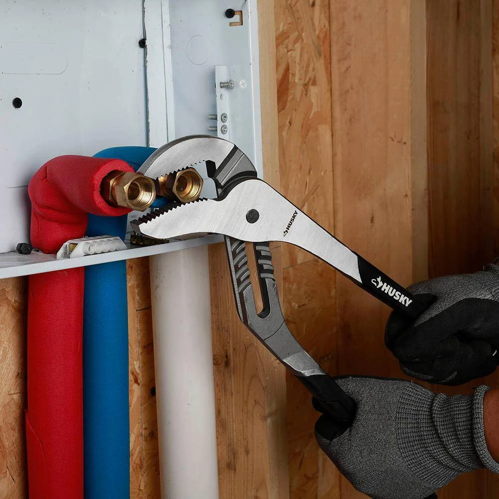 The 12 in. Husky Groove Joint Pliers also known as tongue and groove pliers are often used for gripping irregularly shaped objects. They can also be used for clamping materials. They are also commonly used for turning and holding nuts and bolts. An advantage to this design of pliers is that it can adjust to a number of sizes without the distance in the handle growing wider. These pliers generally have long handles for increased leverage.