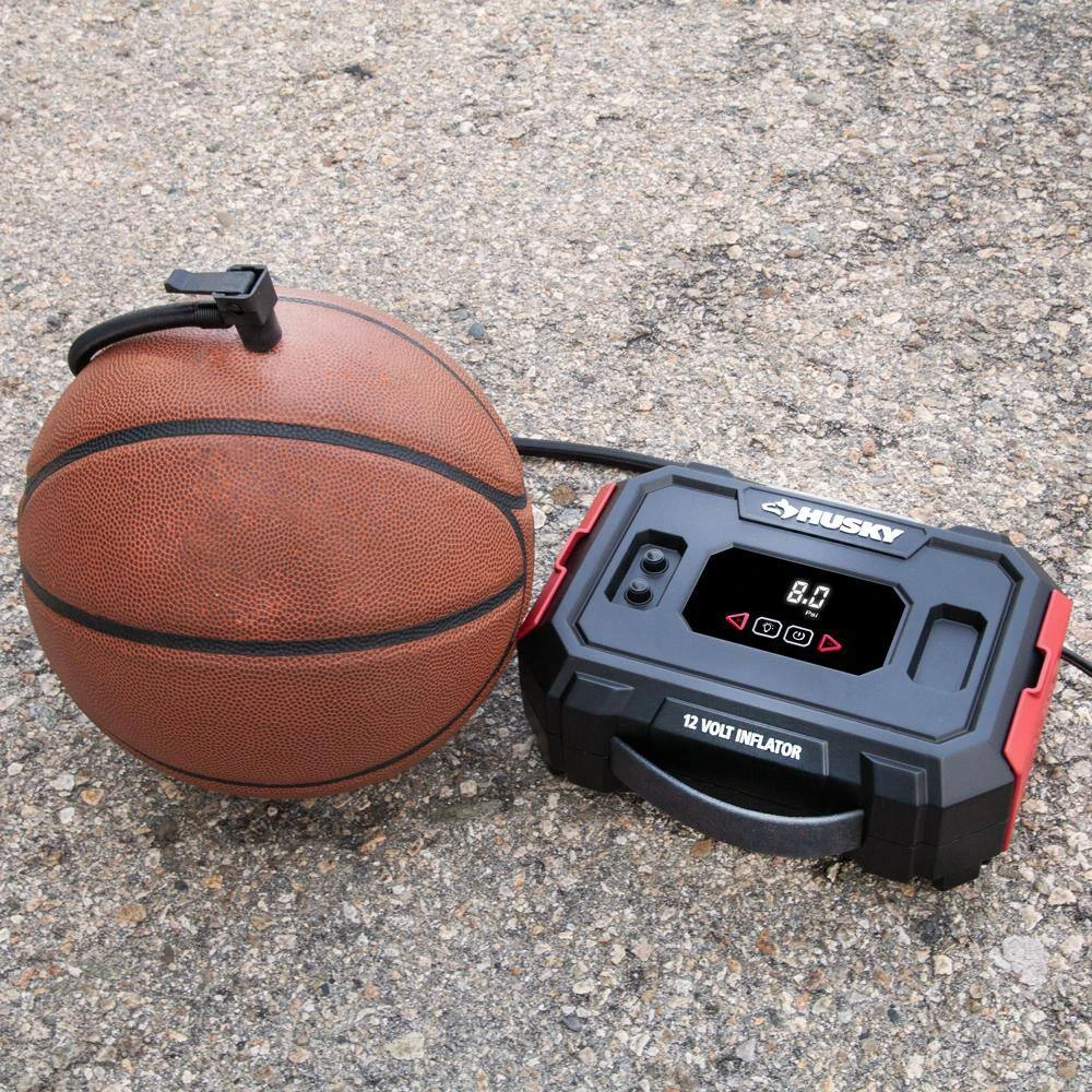 This Husky 12-Volt inflator is convenient to transport and use. Great for sports equipment and mattress adaptors are included to meet nearly all of your inflation needs. Use on your car tires, motorcycle or ATV tires, basketballs, soccer balls, air mattresses and more. The inflator features a backlite digital pressure gauge that is easy to read. Set your target PSI and the inflator will automatically shut off when the target PSI is reached. It plugs into a 12-Volt vehicle outlet for on-the-go convenience.