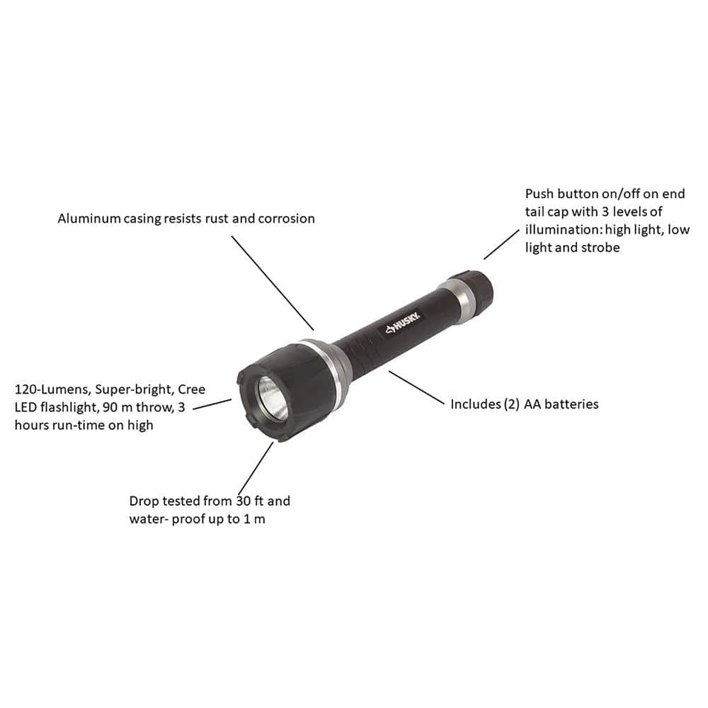 The Husky 120 Lumens unbreakable Flashlight features durable aluminum. The light provides 3 modes of operation, high, low and strobe functions. Drop test rated from 30 ft. and water-proof to 1 m. It is with super bright Cree LED and Energizer Alkaline battery, up to 120 Lumens and can operate for a maximum of 3-hours run time.