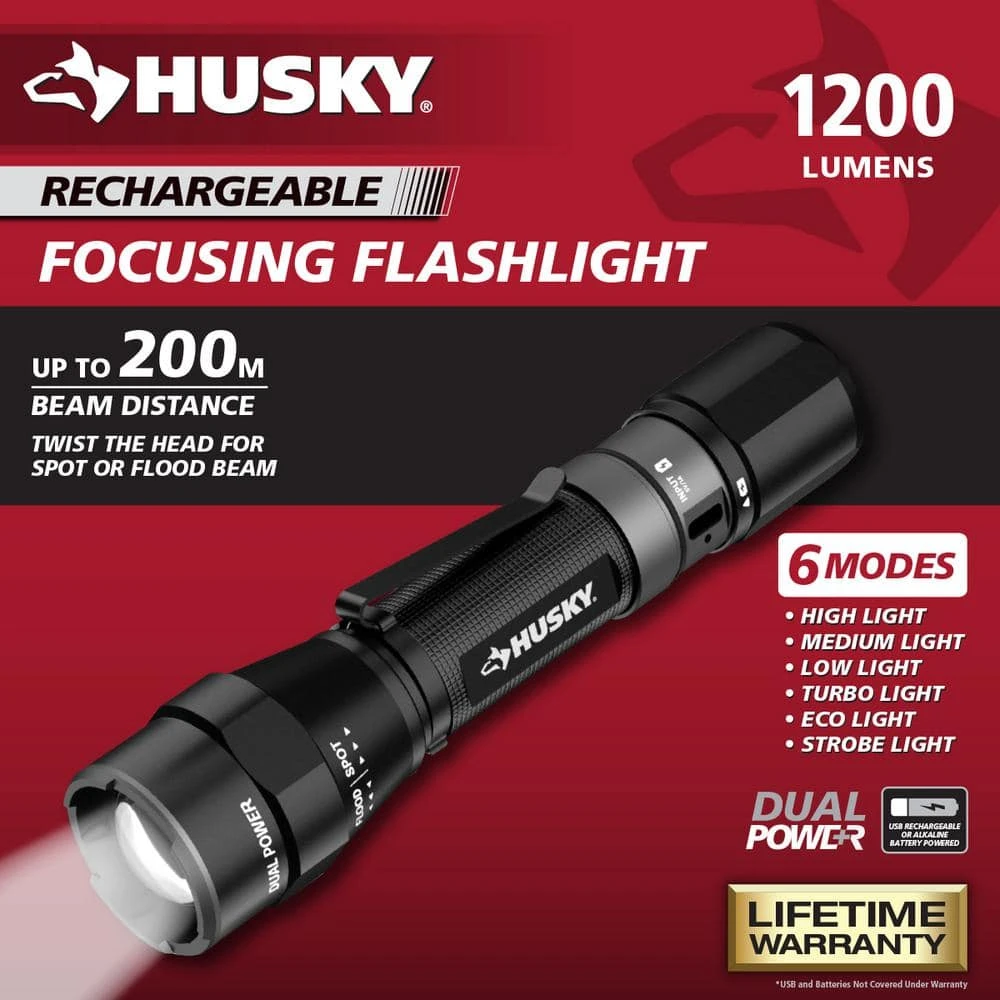 The Husky 1200-Lumen Dual Power Rechargeable Flashlight provides brightness and extreme long life. This flashlight has 6-Light modes including turbo. Turbo mode propels the lumens to a blazing 1500 lumen for 45 seconds. The twist focusing makes switching from spot to flood a simple twist. Included are a rechargeable battery, that can be charged without removing the battery, and a USB C charging cable for super-fast charging. The Husky 1200-Lumen Dual Power Rechargeable Flashlight can also be powered by 3 AAA alkaline batteries (not included). With superior optics and color, it also impact resistant, weather resistant and virtually unbreakable. Tested and rated to ANSI/FL1 standards. All this is backed by the Husky lifetime warranty.