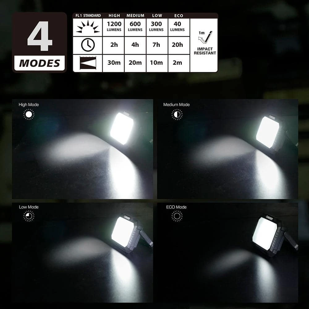 - Specs: High Mode: 1200-Lumens / 2 hours run time / 30 m beam throw; Medium Mode: 600-Lumens / 4 hours run time / 20 m beam throw; Low Mode: 300-Lumens / 7 hours run time / 10 m beam throw / ECO Mode: 40-Lumens / 20 hours run time / 2 m beam throw