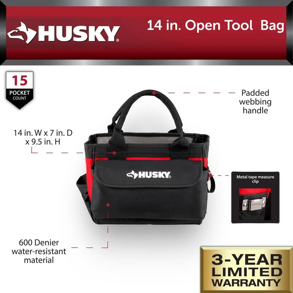 The Husky 14 in. Open Tool Bag is the perfect open-style tool tote for easy and secure transportation of all your favorite tools and accessories. This tool bag features padded webbing handles for increased comfort and long-lasting use. The 600D water-resistant material is ideal for all weather conditions. This tool tote will keep your tools and accessories safe and secure while providing a functional structure for easy access while on the job. A metal tape measure clip securely stores your tape measure while you work. This tool bag can couple perfectly with your other Husky tool storage pieces. Be sure to add this Husky Tool Bag to your collection today.