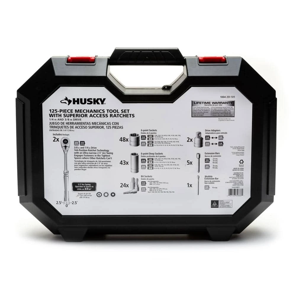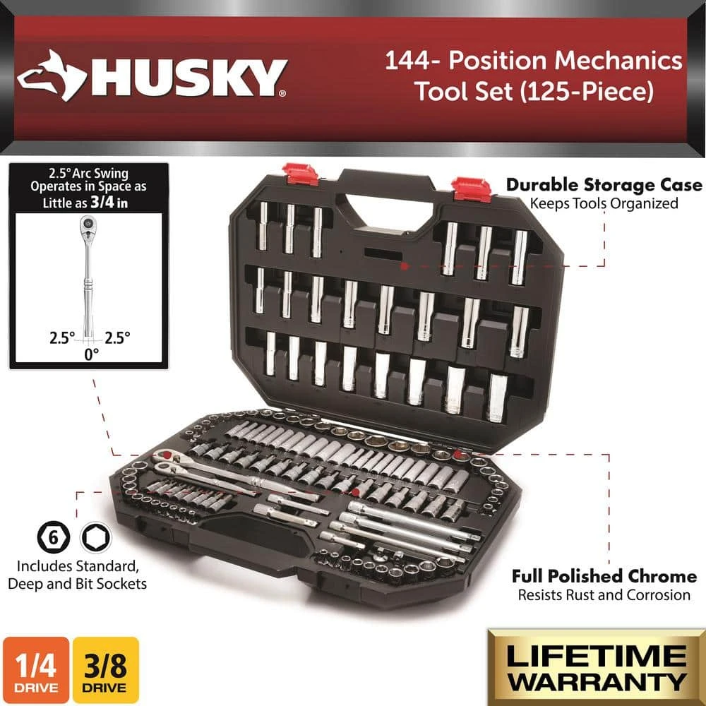 The dual-pawl technology of the 144-position ratchet in this Husky 125-piece mechanics tool set provide industry leading access to bolts and fasteners where other ratchets simply can’t. The 91 standard and deep 6-point sockets work to get the job done. The Husky 125-piece 144-position mechanics tools set is perfect for professional mechanics or the DIYer working around the house or in the garage needing access to hard to reach fasteners.