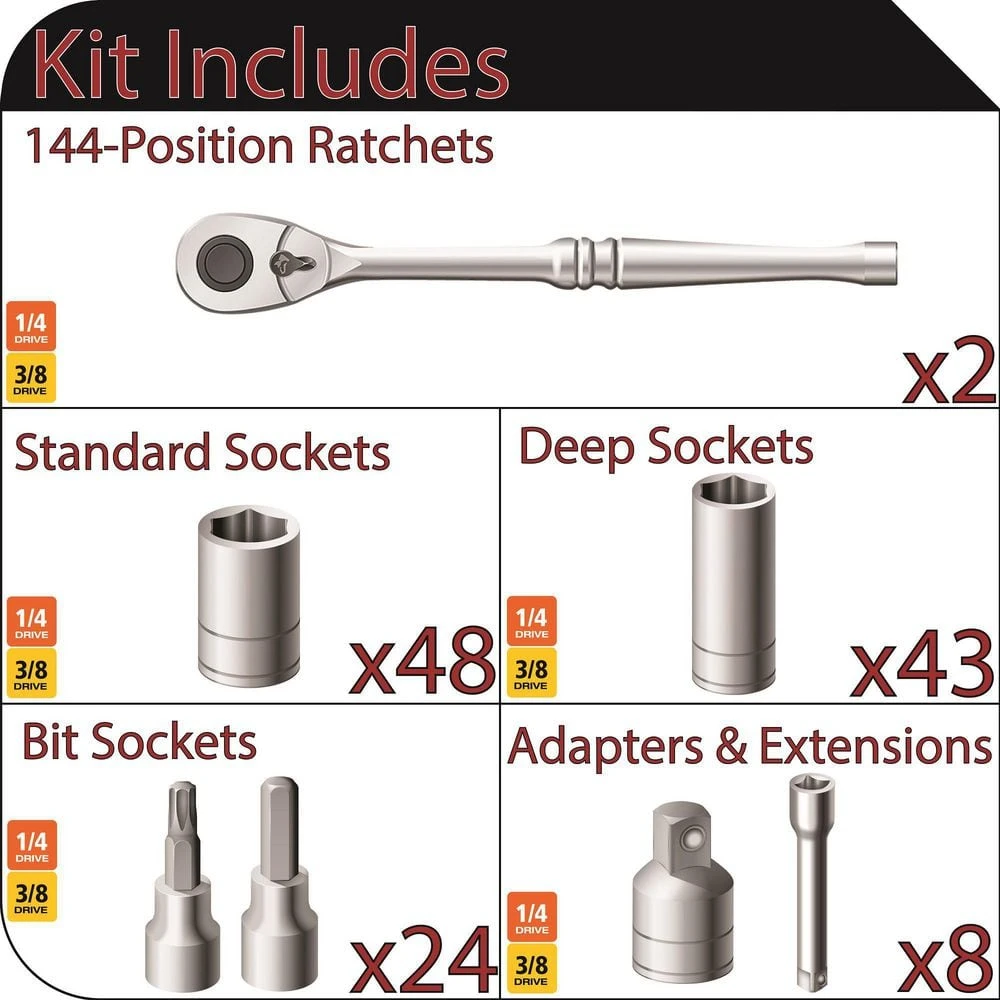 - Includes SAE and metric sockets