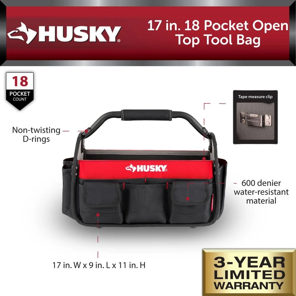 The Husky 17 in. Open Tool Tote offers an Open Top with a Rotating Handle allowing for full access to tools stored inside. This item also offers reinforced pockets for durability through years of use. The Husky 17 in. Open Tool Tote with Rotating Handle is the perfect fit for anyone in need of open top storage and long-lasting durability. This tote is the perfect addition to your Husky Tool Bag collection. Constructed of 600 Denier water resistant material. This product carries a 3-year limited warranty.