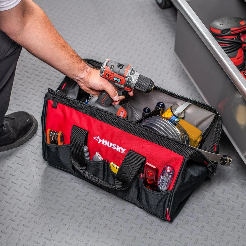 The Husky 18 in. Tool Bag is constructed of 600 denier, water-resistant material and includes 14 large pockets. This tool bag has a wide mouth opening with a dual zipper top for easier access to the interior. A large main compartment is for larger tool storage. Use the Husky 18 in. Tool Bag with your Husky tool pouches. This product carries a 3-year limited warranty and includes a shoulder strap.