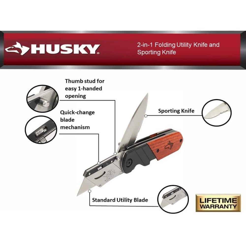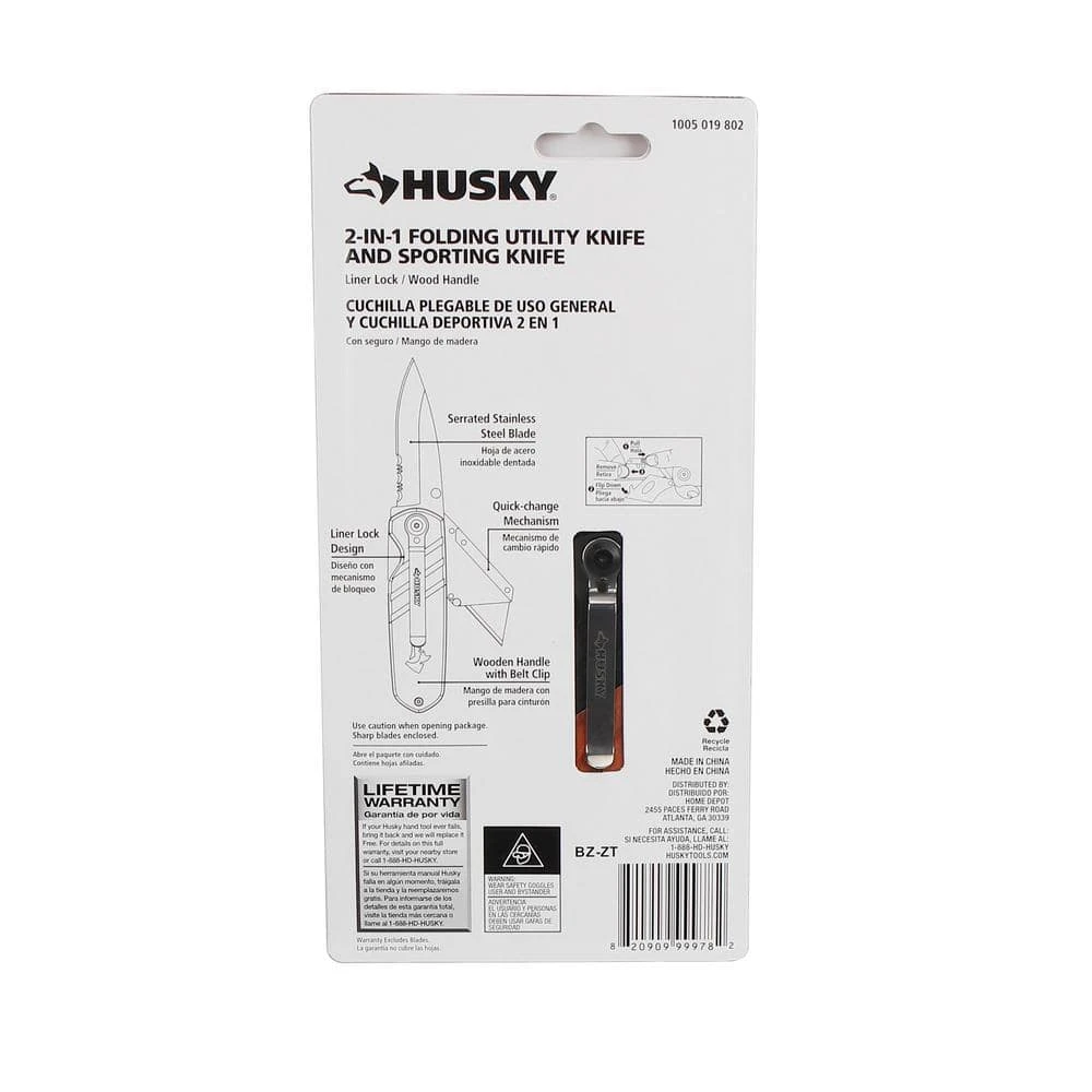 The Husky Dual Blade Folding Knife with Wooden Handle is an offers the functionality of two essential knives in a single, pocket-sized unit. This design seamlessly integrates a dedicated folding utility knife and a folding serrated sporting knife, eliminating the need to carry multiple separate tools. The first component, the folding utility knife, is equipped with an advanced quick-change blade mechanism, allowing for effortless, tool-free replacement of standard-size utility blades. Simply engage the release to safely eject a dull blade and insert a new one, ensuring a consistently sharp edge. The second component, the folding serrated sporting knife, features a permanently mounted blade specifically designed with serrations. These teeth are engineered to aggressively grip and slice through challenging materials like rope, strapping, fibrous plants, or small branches with a efficient sawing motion, outperforming straight edges on tough cuts. Both blades are secured by a reliable side lock design. This critical safety feature engages a locking bar along the side of the handle to firmly brace each blade in its fully open position, preventing any accidental folding during use, This combination of versatility, safety, and convenience makes the Husky Dual Blade knife an indispensable companion for a vast array of applications, from household repairs and demanding job site tasks to camping, hiking, and other outdoor adventures.