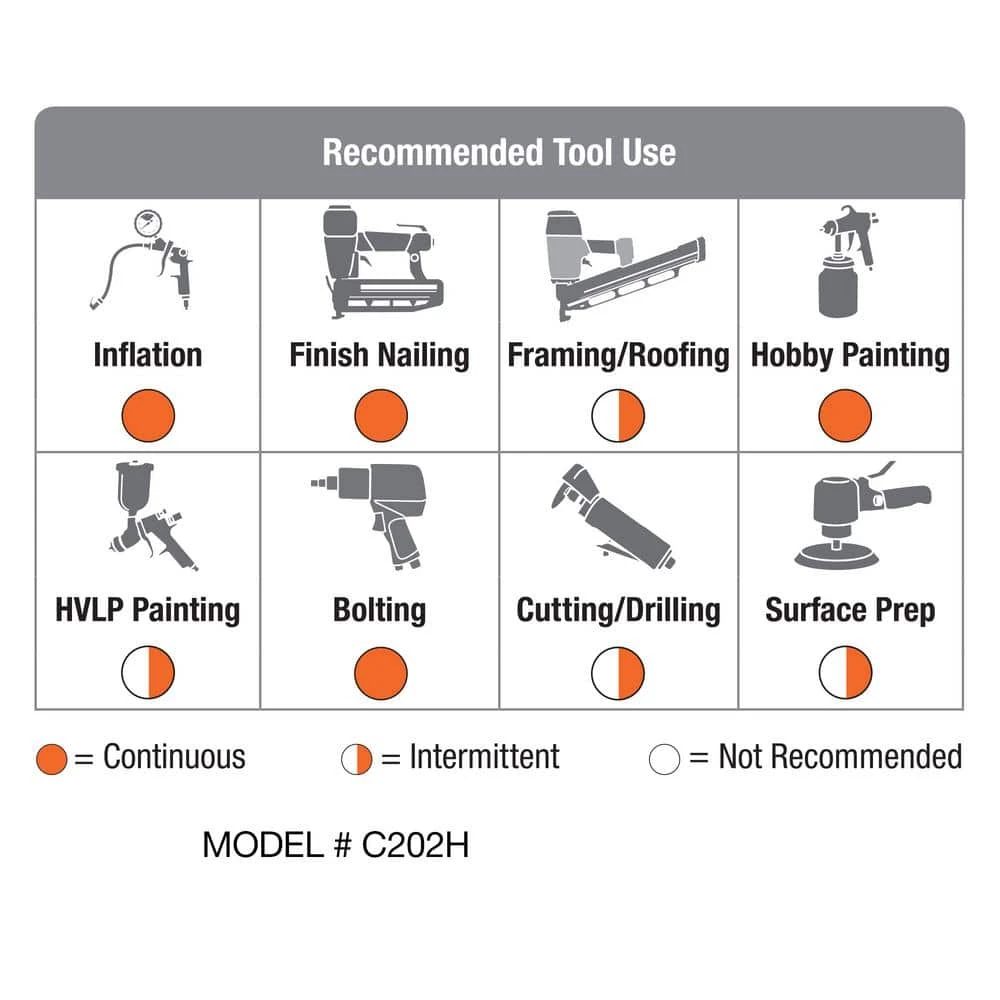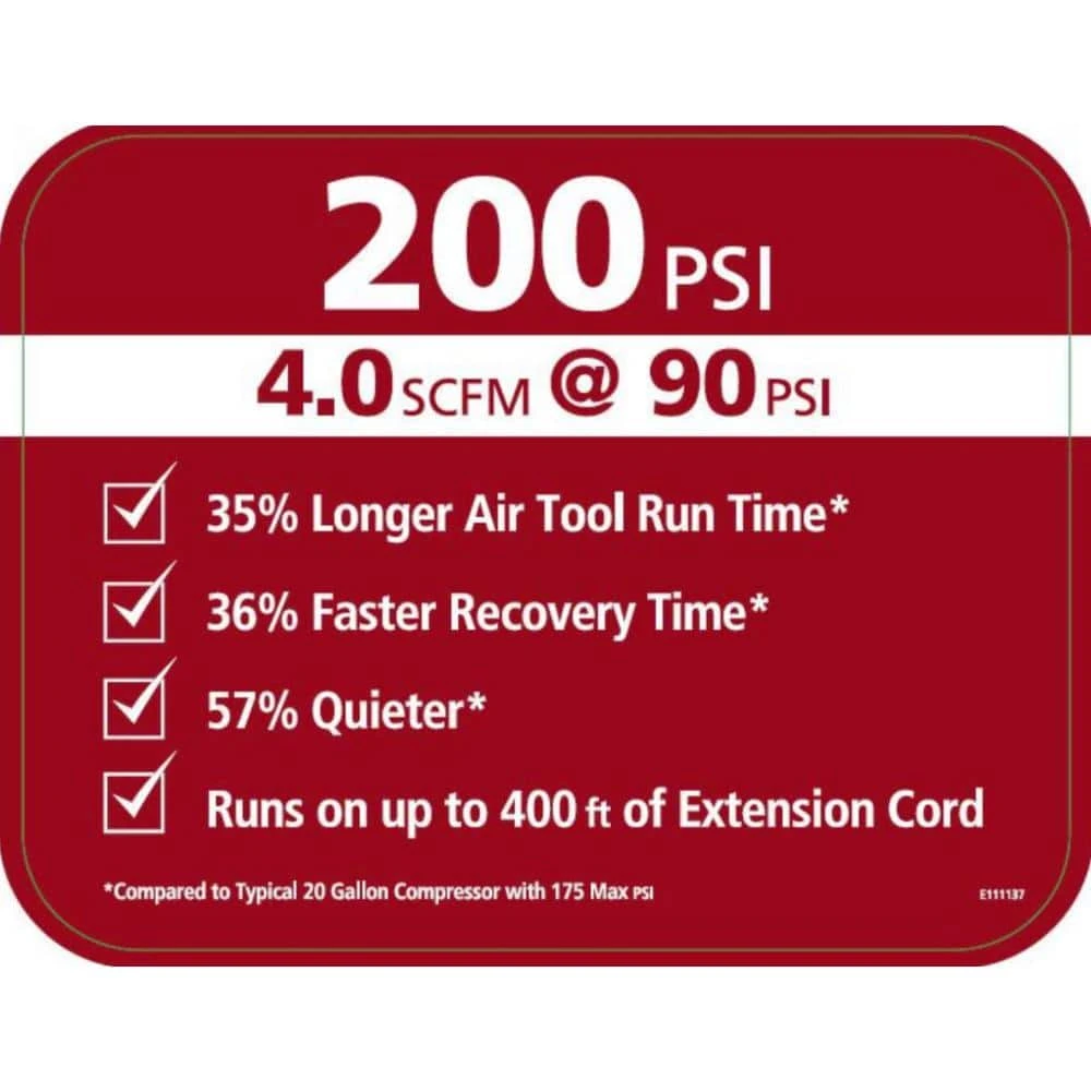 - 200 maximum psi for 35% longer air tool run times compared to typical 20 Gal. compressor with 175 maximum psi