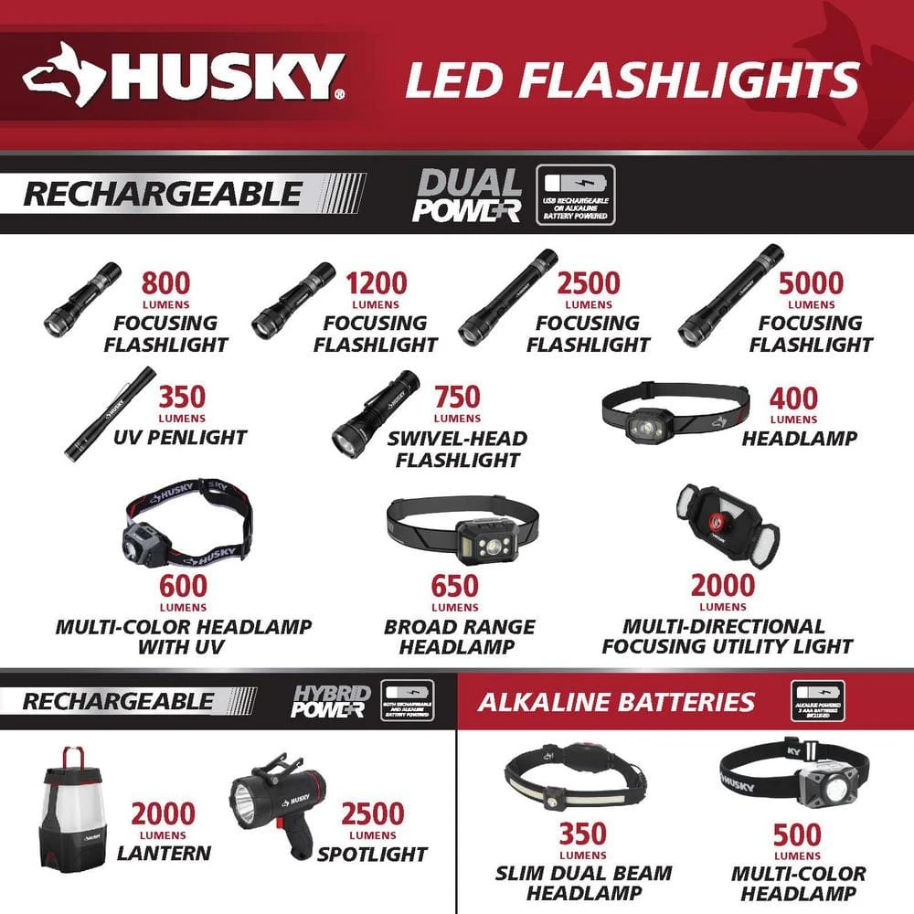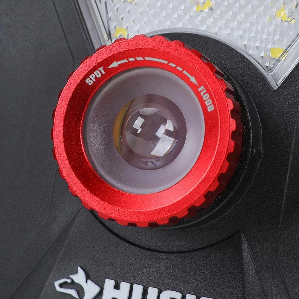 The 2-Pack Husky 2000 Lumens Rechargeable Utility lights feature a 2-panel Multi-Directional light. The 2 panels can rotate 270°, giving you a wider light angle for your projects. The middle spot- light easily adjusts the focus from flood light to spot- light. Features a 180° adjustable, foldable handle allowing you to position the light where needed while providing easy to carry convenience. Each light is powered by (2) 2000mAh Rechargeable Lithium-ion batteries for a total 4000mAh. ECO mode for Extended long run time.