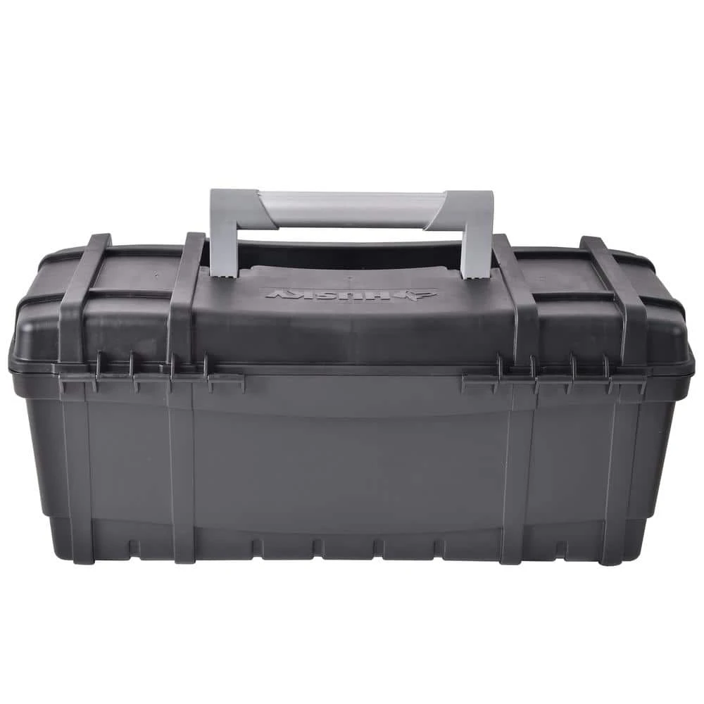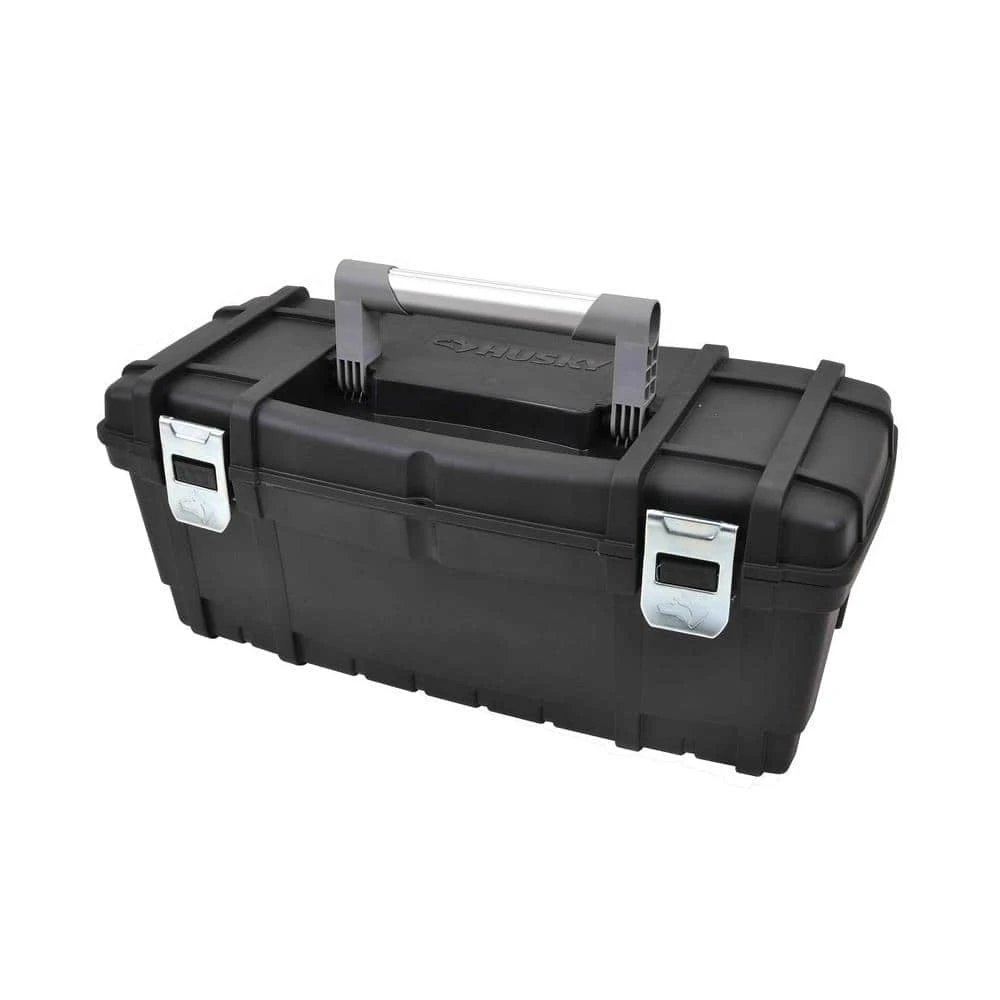The Husky 24 in. Tool Box is constructed of durable polypropylene and features heavy-duty metal latches and a padlock eye for safe, secure tool storage. The large body box accommodates everything from power tools to small hand tools while the metal handle makes any load easy to carry. This tool box is perfect for everything from the home to the jobsite.