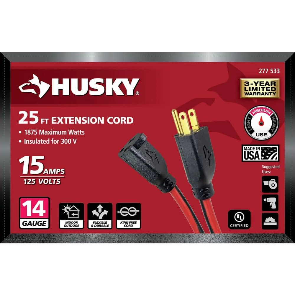 This Husky 25 ft. 14/3 Medium Duty Extension Cord features grounded plugs for added safety and protection. The plugs are molded on creating additional durability for your cord. This cord is designed for indoor and outdoor use. The SJTW jacket is flexible and durable creating a kink free cord experience.