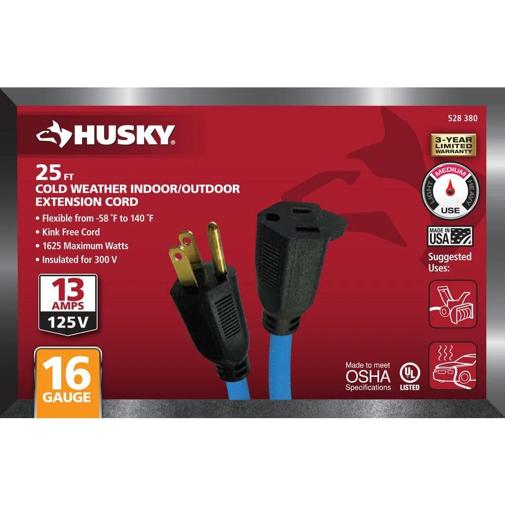 This Husky 25 ft. 16/3 Medium Duty Cold Weather Extension Cord provides you with flexibility in cold temperatures. The SJTW jacket stays flexible from -58°F to 140°F. This cord features grounded plugs providing you with additional safety. The plugs are molded on giving the cord additional durability.