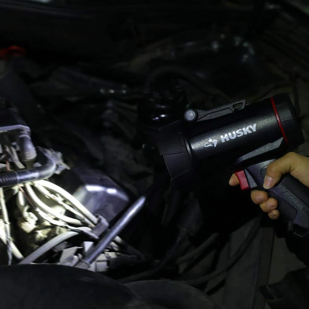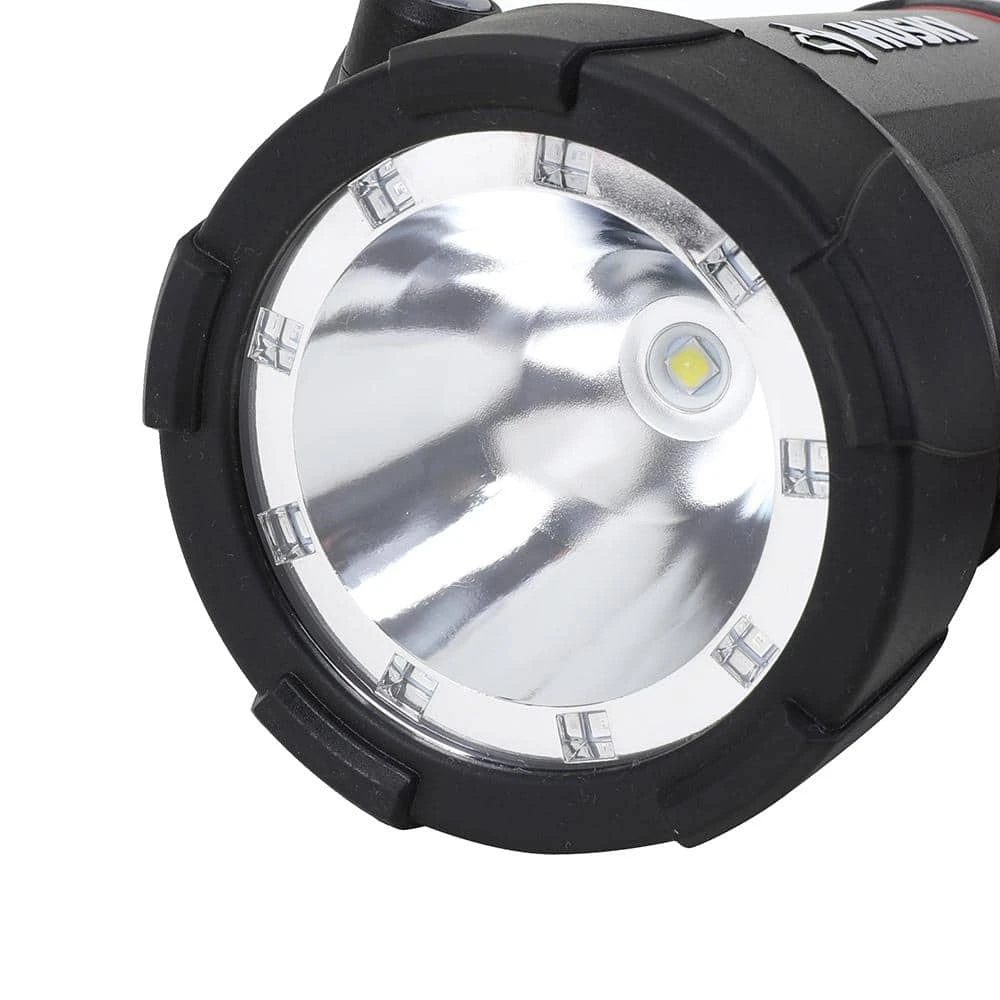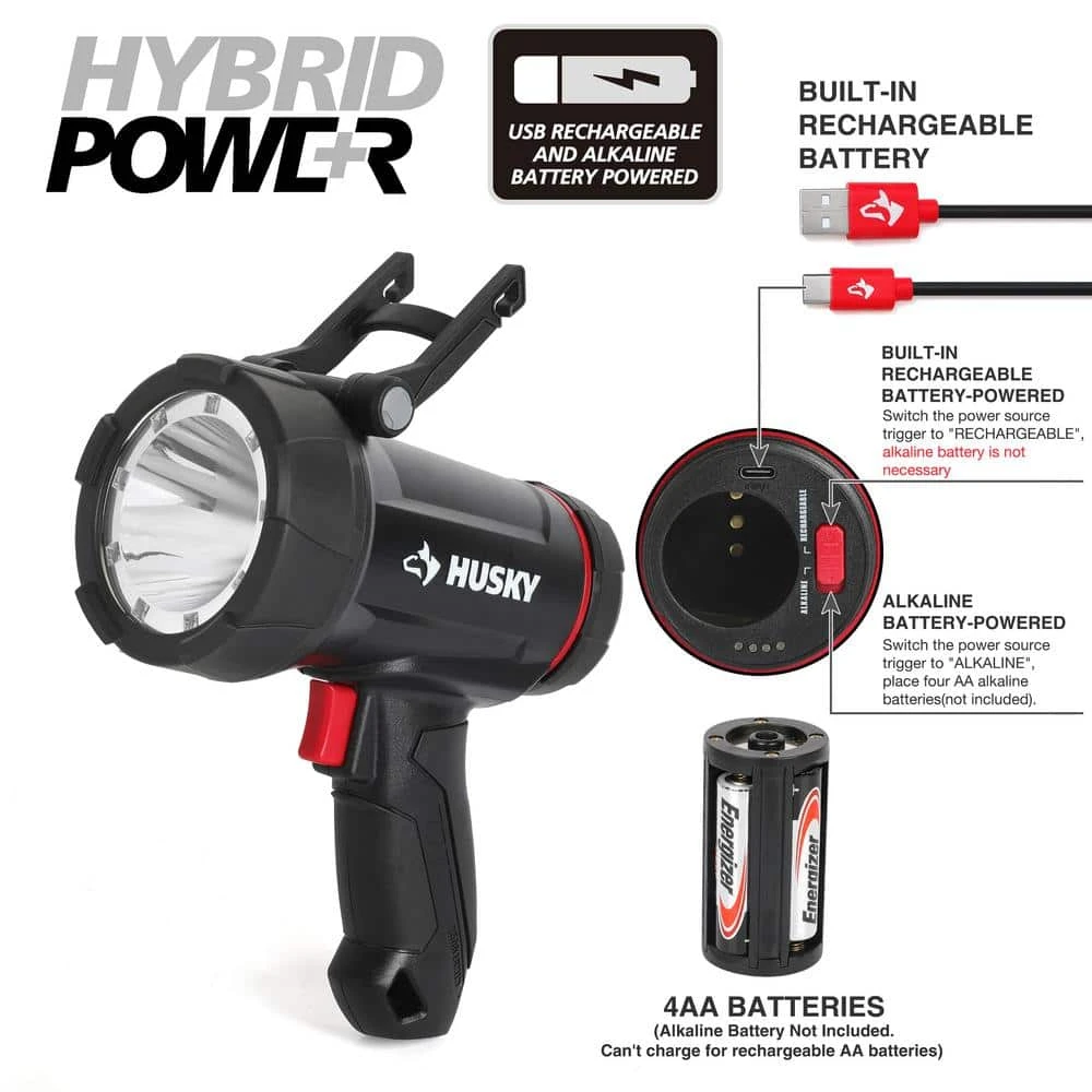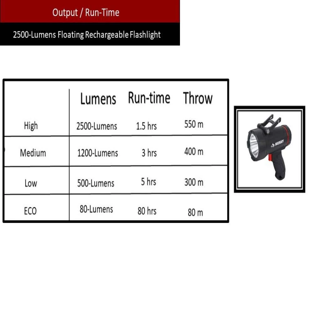 This Husky 2500-Lumens Hybrid Power Floating Rechargeable Spotlight features a compact size spotlight with super bright LED lights. High mode provides up to 2500-Lumens, 550 m throw. The 6-mode capacity provides light options for all your different projects. Modes include: high light, medium light,low light, ECO, red light, and red flashing. High, medium, and low modes provide the right amount of light for your projects, while the red helps with night vision. IPX7 waterproof and floating construction withstands the most extreme weather conditions. This spotlight will automatically flash red when in water. Features include a built-in intergrated hook and kickstand for hands-free Use. Can be powered by either Rechargeable Lithium-Ion Rechargeable Battery or (4) AA Batteries in case of emergency (4 AA Battery not included).Floats and will automatically flash red light when it touches waterSpecs: (high mode) 2500-lumens/ 1.5 hours of run time/ 550m throw; (medium mode) 1200-lumens/3 hours of run time/ 400m throw; (low mode) 500-lumens /5 hours of run time /300m throw; (ECO) 80-lumens /80 hours of run time /80m throwPowered by Either Rechargeable Lithium-Ion Rechargeable Battery or (4) AA Batteries in case of emergency (4 AA Battery not included)ECO mode for Extended long run timeUSB cable included
