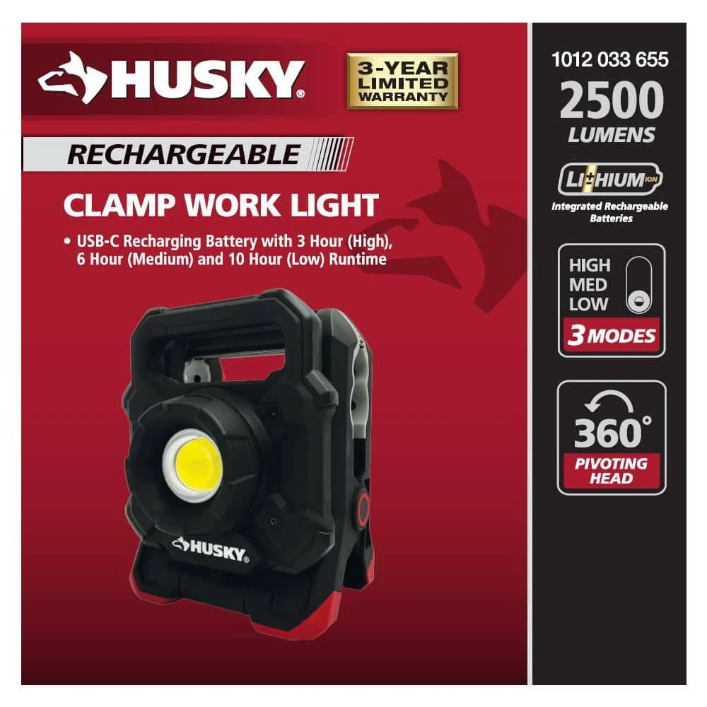 The Husky Clamp Work Light pivots a full 360° putting light anywhere you need it. The sturdy integrated clamp holds tight to most pipes, doors, wood framing and more. Don’t worry about any scratching or scuffing, the non-marring feet leave no trace. Utilizing COB technology, this light runs brighter and longer than traditional LEDs – boasting 2500 Lumens with a USB-C rechargeable battery. When this light is not clamped you can easily stand it up, converting it to a free-standing work light. Constructed of rugged aluminum and ABS plastic this light will stand up to the elements.