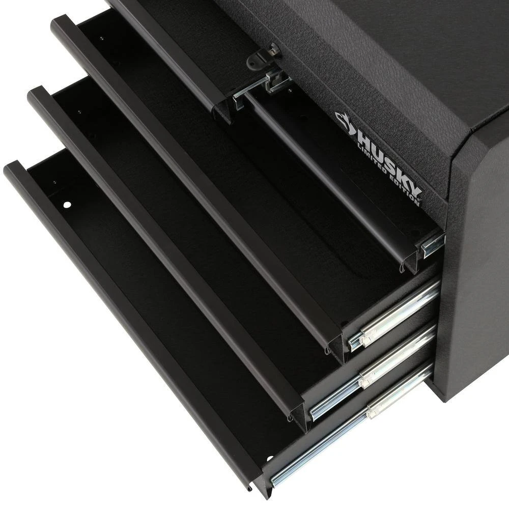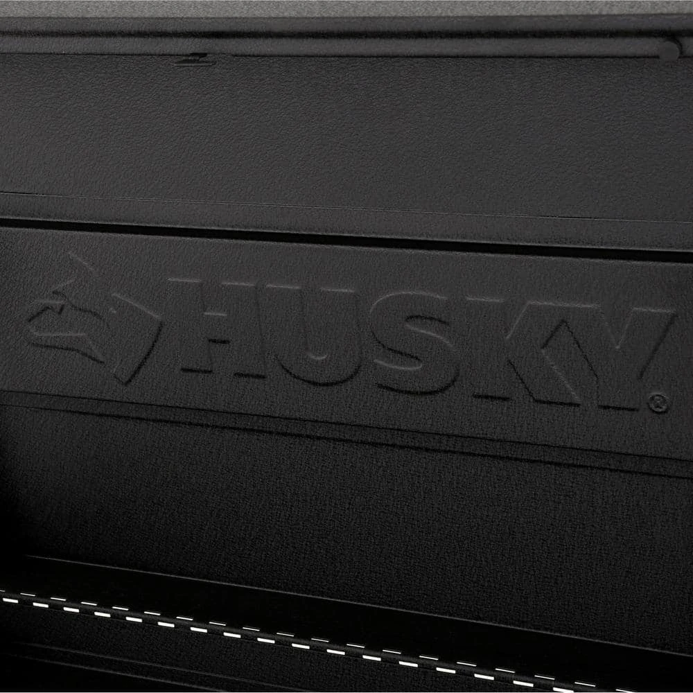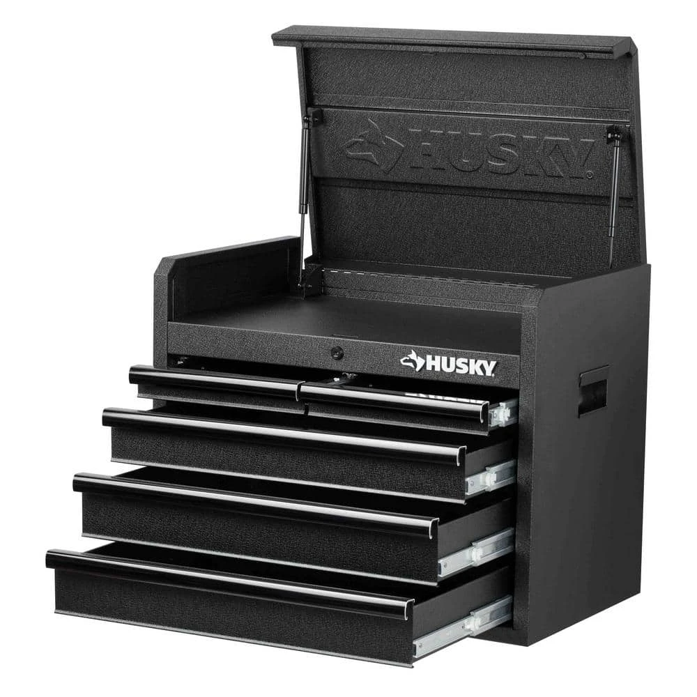 Make the best use of your garage with the efficiently designed Husky 26 in. 5-Drawer Tool Chest in Textured Black. Great for holding heavy equipment, this tool chest is built with an all-welded steel construction to offer increased durability. This tool chest has a textured powder coat paint finish that features rust-resistant properties, which adds a protective layer to your unit to ensure your hardware remains secure when not in use. It has a 25.9 in. W x 15.7 in. D x 2.5 in. H lid that features gas struts, providing improved safety when opening and closing. It features 5-drawers – 2 small, 2 medium and 1 large and features a total holding capacity of 5,113 cu. in., offering plenty of storage for all your equipment. Perfect for effortless closing and opening, this Husky high-quality tool chest is made with soft-closing ball bearing slides that can hold up to 100 lbs. to handle heavy loads. This high-quality tool chest is made with an internal locking system with 2 keys, designed to offer you peace of mind. Designed to occupy less space, it features 2 recessed handles, so you can place it in any corner of your workshop. Stay organized on every job with the Husky 26 in. 5-Drawer Tool Chest in Textured Black.