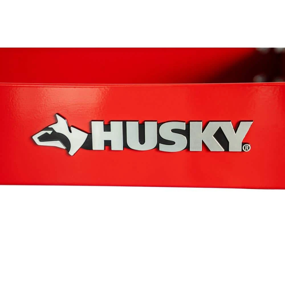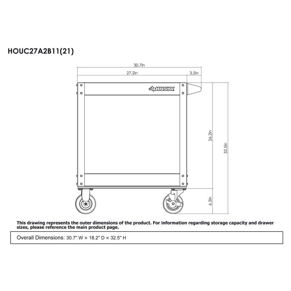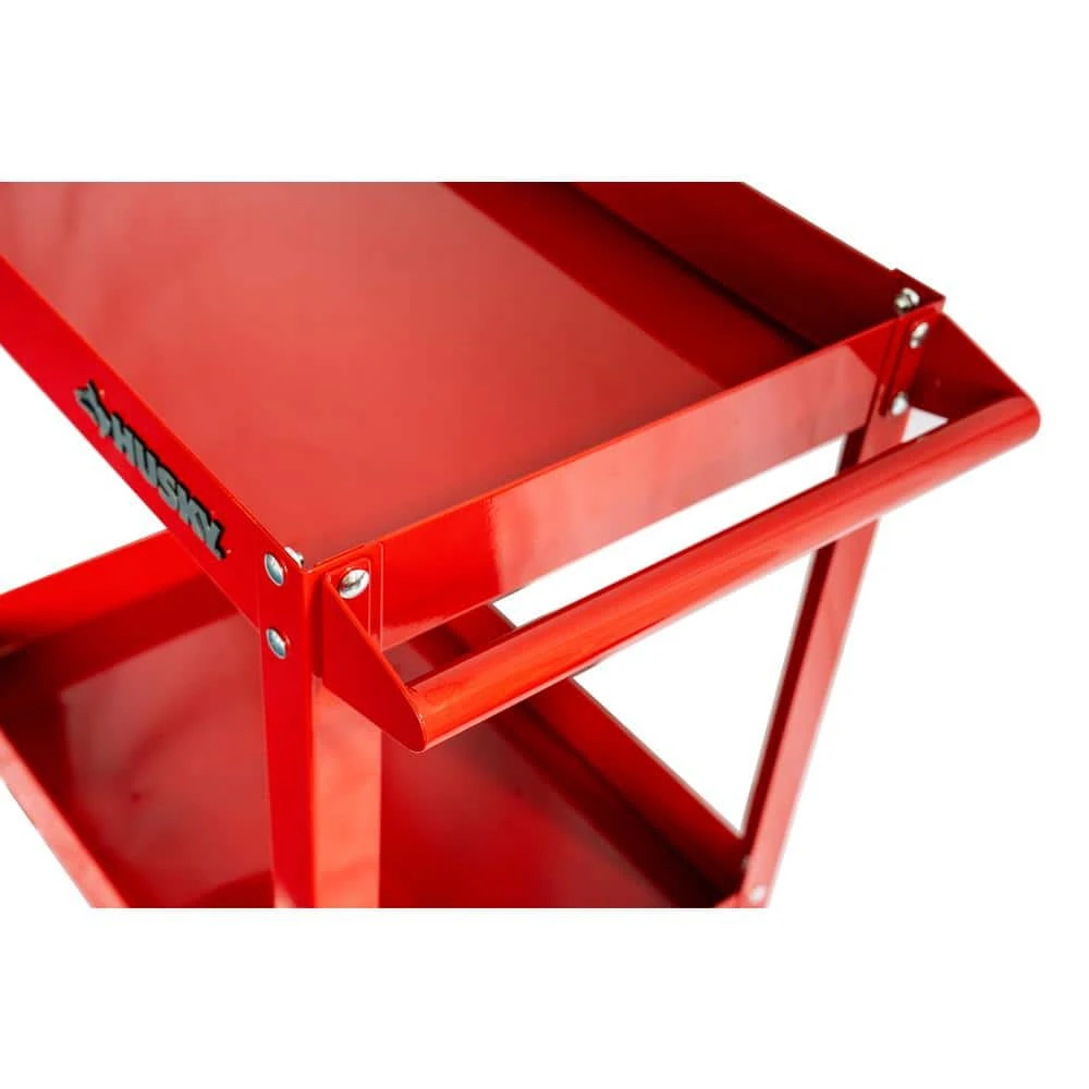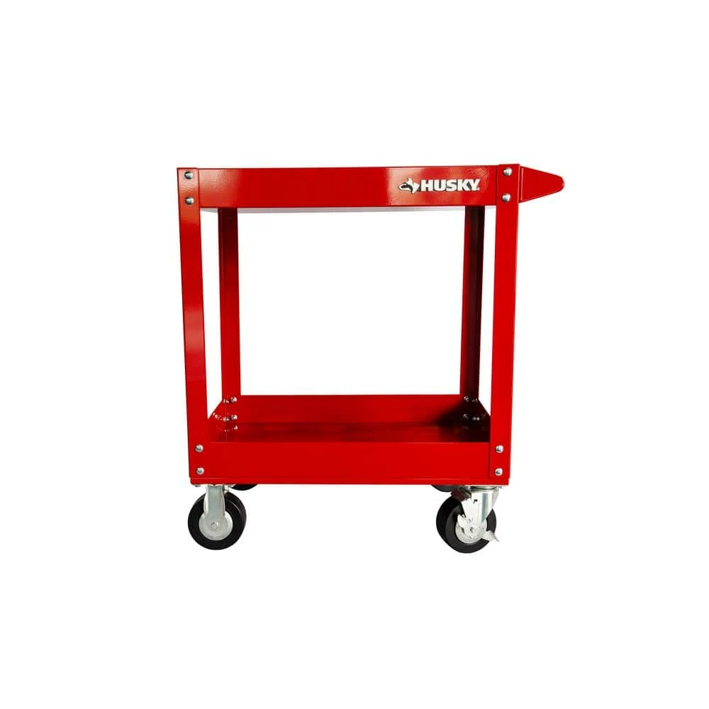 The Husky 27 in. 2 tier cart Mechanics Tool Cart is a utility cart that is essential in the shop, garage or even the office. The cart has 2 trays to hold a variety of tools. The top and bottom storage area is a perfect place to keep your commonly used items easily within reach. The larger, push-bar handle and heavy-duty, 5 in. x 2 in. casters allow this cart to be easily moved around your work area. With no clumsy washers and nuts to deal with, this tool cart can be assembled in minutes with the included bolts and pre-mounted threads. This cart has 12,826 cu. in. capacity.