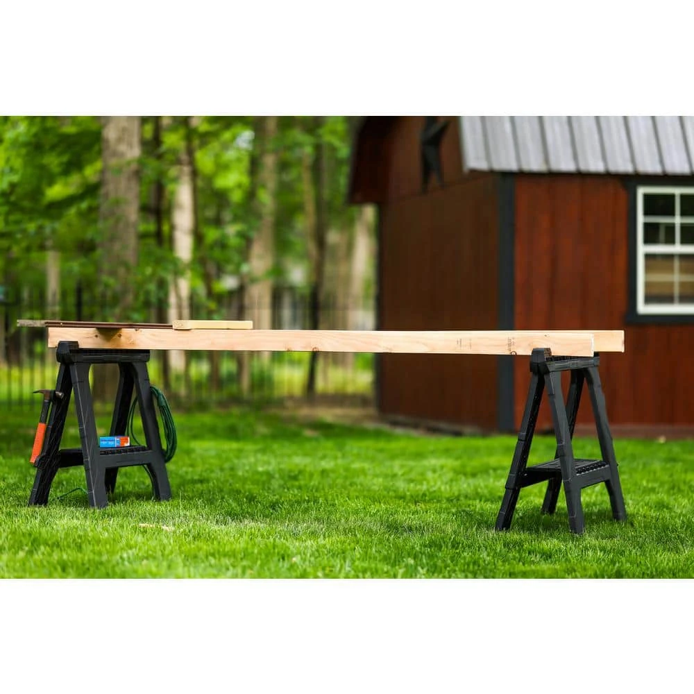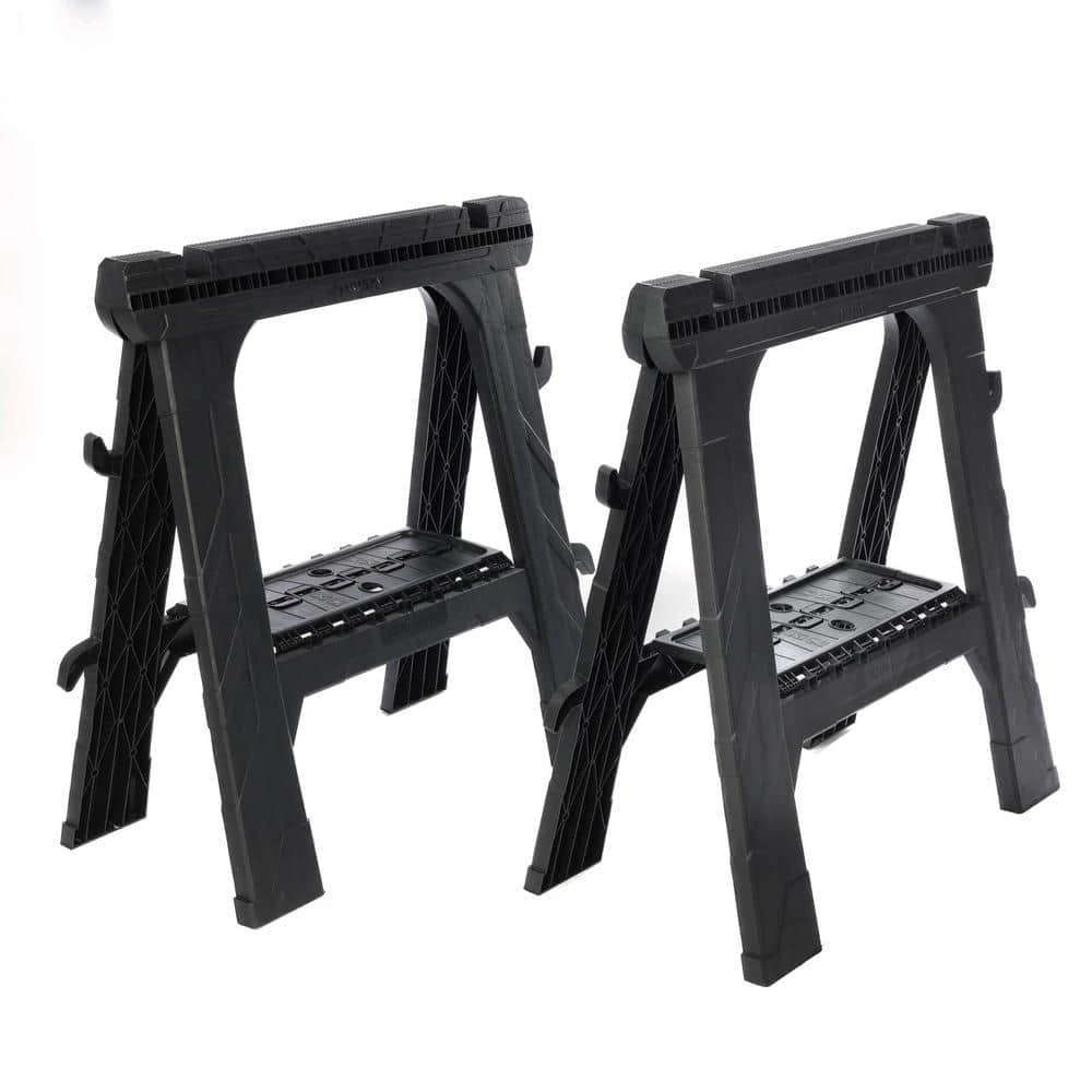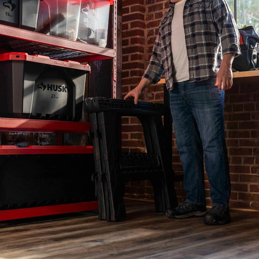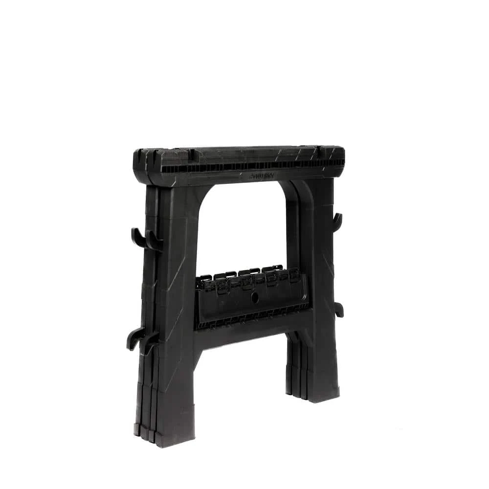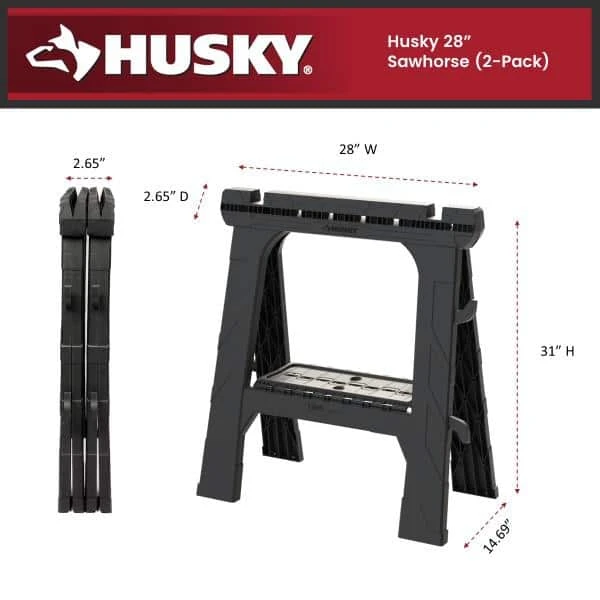 The 28 in. Husky Folding Sawhorse (2-pack) offers a sturdy core construction capable of supporting up to 1200 lbs. per pair. Durable polypropylene material resist rusting, denting and peeling. The durable cross support design allows easy set-up, tear down and storage along with the durability to handle the toughest jobs. Rubber-coated feet have been added for stability.