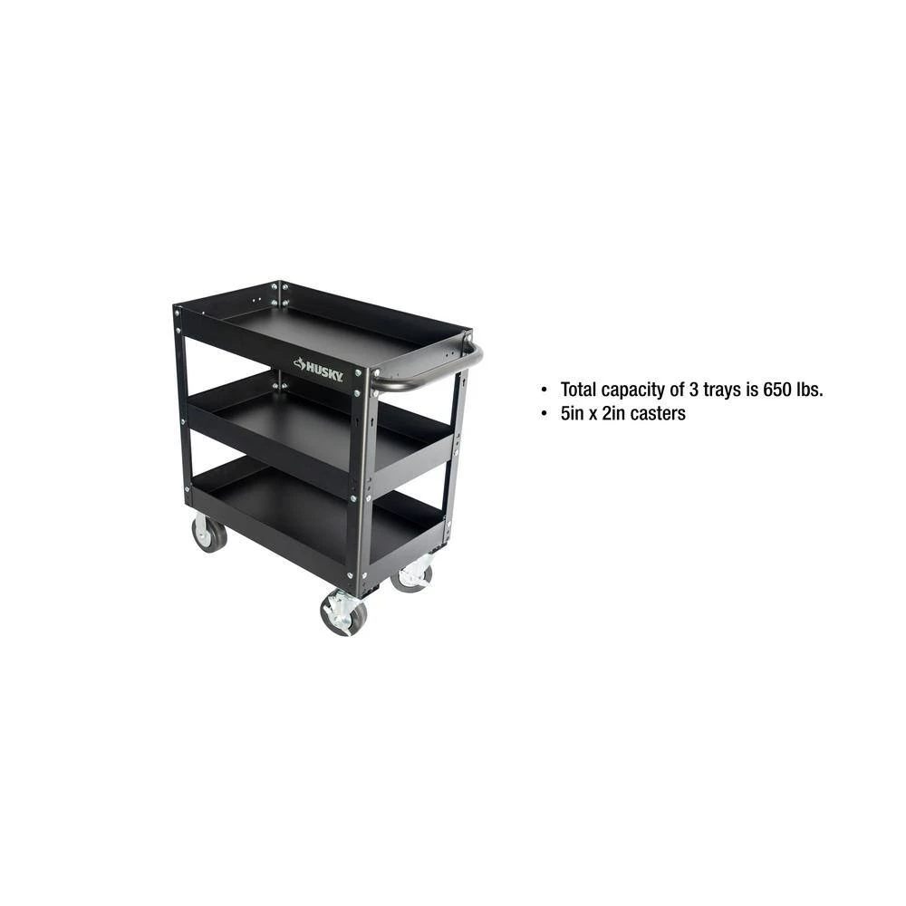 The Husky 28 in. wide 17 in. deep 3 tier mechanics tool cart is a utility cart that is essential in the shop, garage or even the office. The cart has 3 trays to hold a variety of tools. The trays are a perfect place to keep your commonly used items easily within reach. The larger, push-bar handle and heavy-duty, 5 in. x 2 in. casters allow this cart to be easily moved around your work area. With no clumsy washers and nuts to deal with, this tool cart can be assembled in minutes with the included bolts and pre-mounted threads. This cart has 13,426 cu. in. storage capacity.