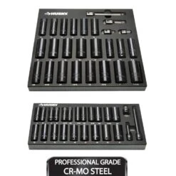 Husky 1/2 in. drive deep SAE/Metric impact socket set contains 50 total pieces: 43 deep 6-point impact sockets and 7 impact adaptors and extensions. Features sockets forged from chrome molybdenum alloy steel (Cr-Mo) and designed to withstand rigors of heavy-duty auto and industrial use. Size markings have been hard stamped into the sockets for quick and easy identification that will never wear away. These impact sockets also feature off-corner loading which helps prevent fastener rounding, plus a pin hole at the base of each socket for use with pin for a secure attachment to drive tools. An oiled black oxide finish gives you maximum corrosion resistance. This 50-piece Husky deep impact socket set is perfect for both the professional mechanic’s or DIYer’s garage.