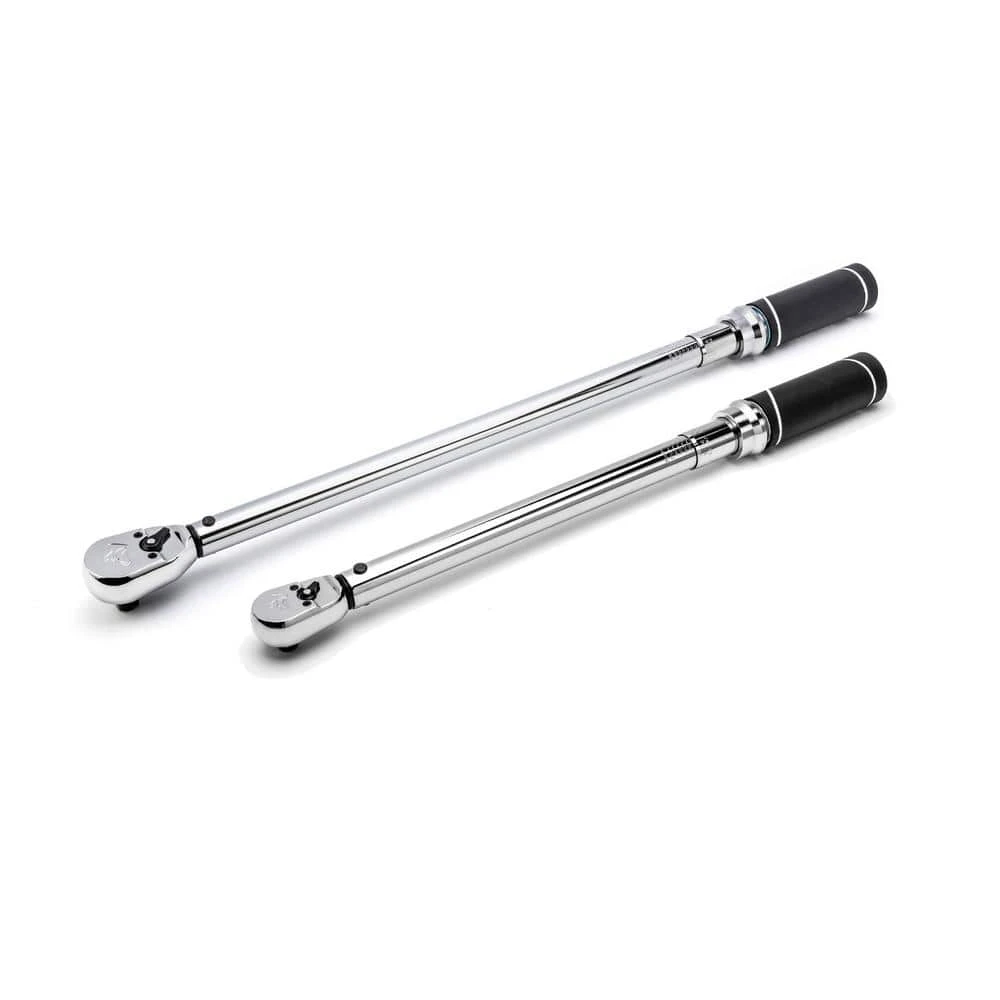 The Husky 3/8 in. and 1/2 in. Drive Click Torque Wrench Set is made of alloy steel construction for strength and long-lasting performance. Their ergonomically designed handles easily turn to set torque. The finish provides resistance to corrosion and wipes clean easily. The 3/8