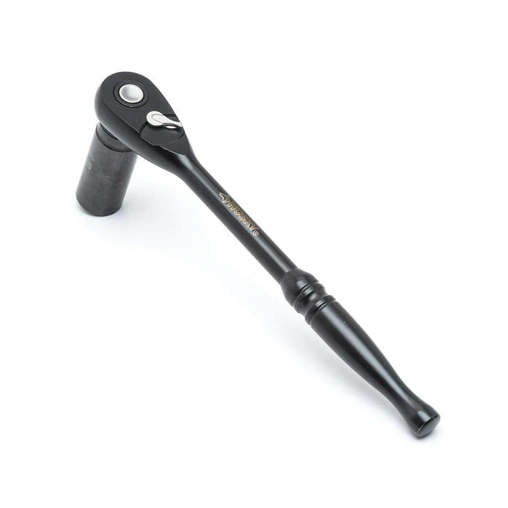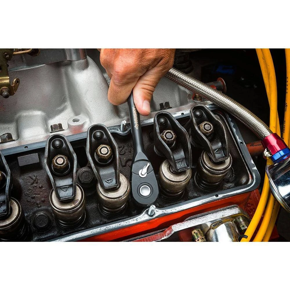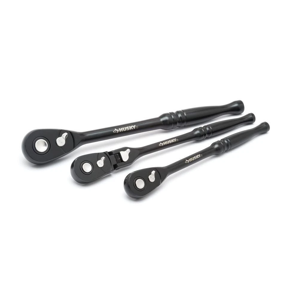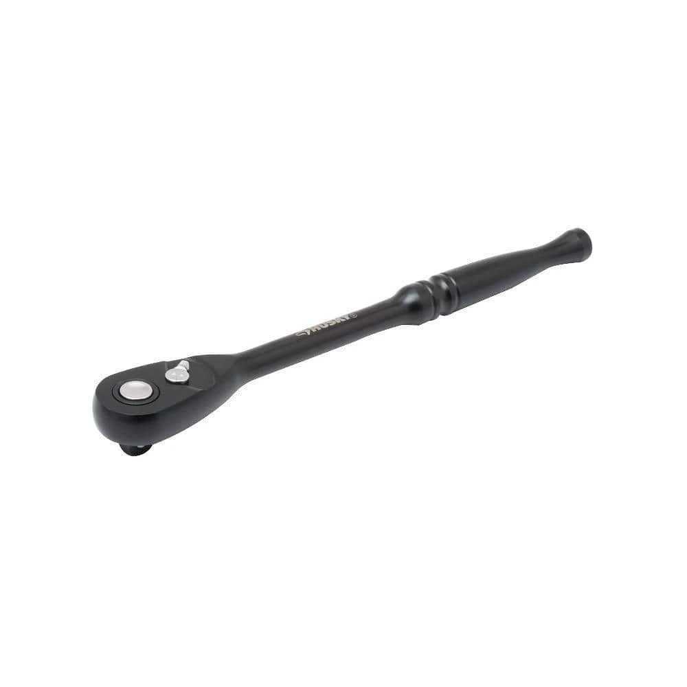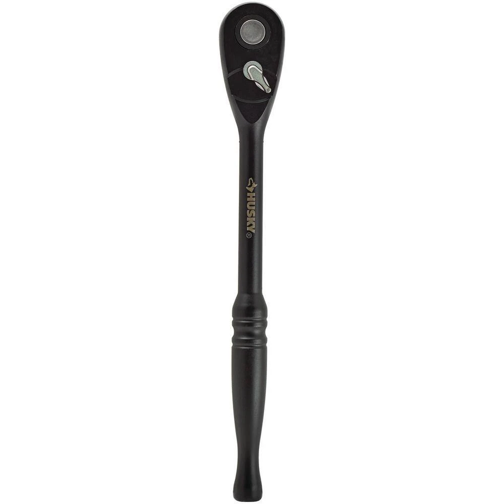 The Dual-Pawl technology of the New Husky 100-Position 3/8 in. drive ratchet provides access to turn fasteners where other ratchets can’t with its ultra-narrow 3.6° arch swing. It is 10% longer handle allows for increased reach to access hard reaching fasteners and improves overall leverage. The Industrial grade black finish gives the tool a sleek look while adding durability and corrosion prevention.