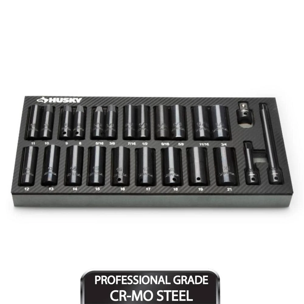 Husky 3/8 in. Drive Deep SAE/Metric Impact Socket Set contains 24 total pieces: 21 deep 6-point impact sockets and 3 impact adaptors and extensions. The set features sockets that are forged from chrome molybdenum alloy steel (Cr-Mo) and designed to withstand rigors of heavy-duty auto and industrial use. Size markings have been hard stamped into the sockets for quick and easy identification that will never wear away. These impact sockets also feature off-corner loading which helps prevent fastener rounding, plus a pin hole at the base of each socket for use with pin for a secure attachment to drive tools. An oiled black oxide finish gives you maximum corrosion resistance. This 24-piece Husky deep impact socket set is perfect for both the professional mechanic’s or DIYer’s garage.