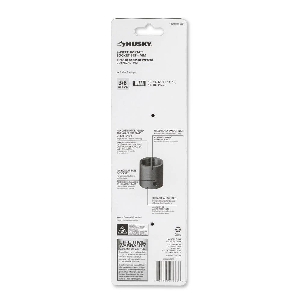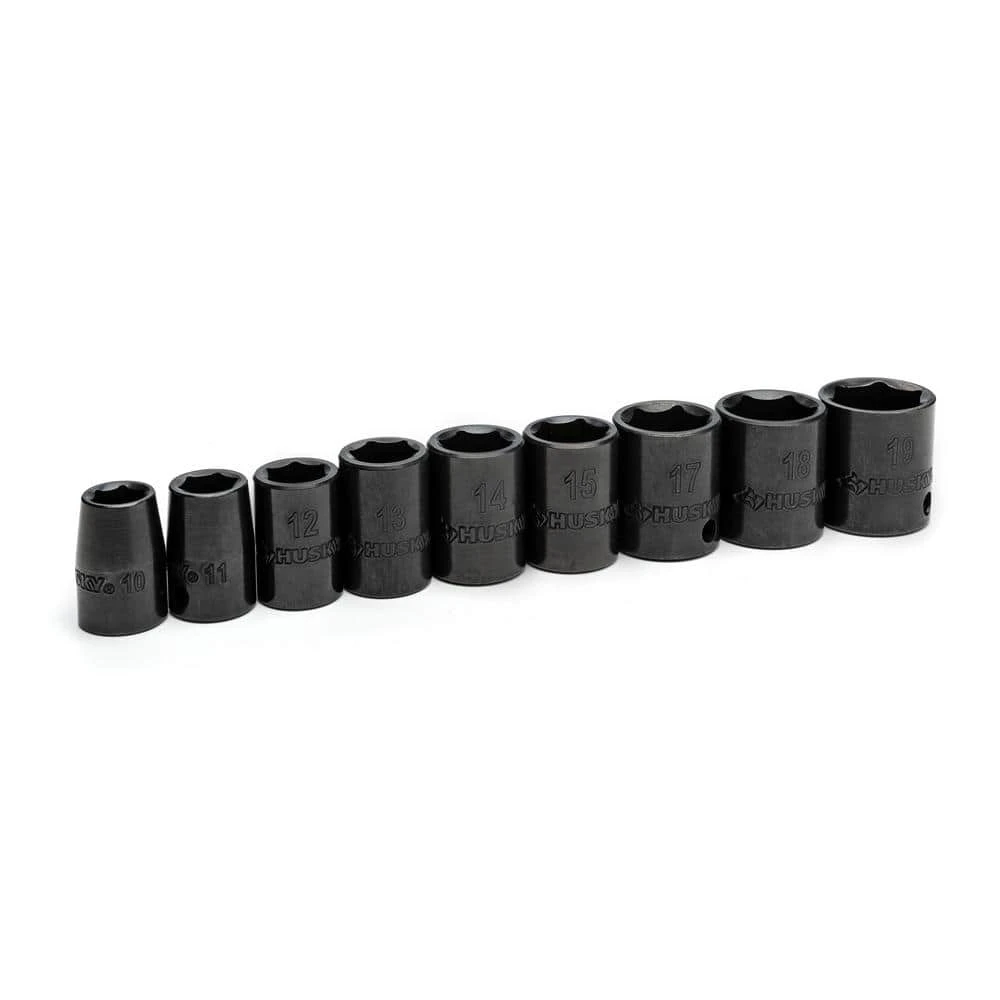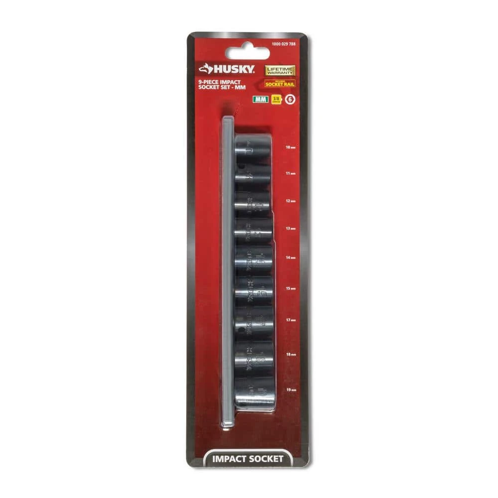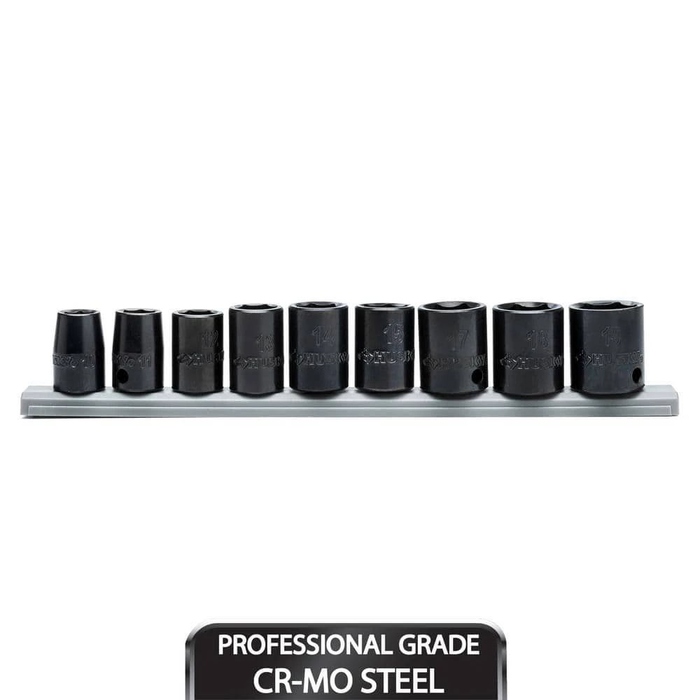 Husky 3/8 in. drive impact sockets are forged from chrome molybdenum alloy steel (Cr-Mo) and designed to withstand rigors of heavy duty auto and industrial use. The oiled, black oxide finish offers maximum corrosion resistance for a lifetime of use. Size markings have been hard stamped into the sockets for quick and easy identification that will never wear away. This Husky socket set also features chamfered lead-ins help to provide fast and easy placement onto drive tools and sockets so you can spend less time fighting your tools and more time getting the job done. The off-corner loading helps prevent the rounding of fasteners. This 9-piece Husky impact socket set is perfect for both the professional mechanic’s or the DIYer’s garage.