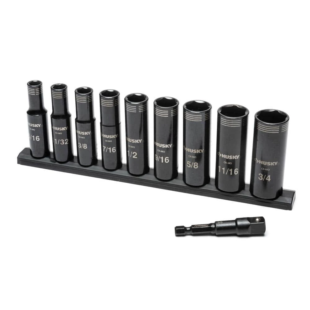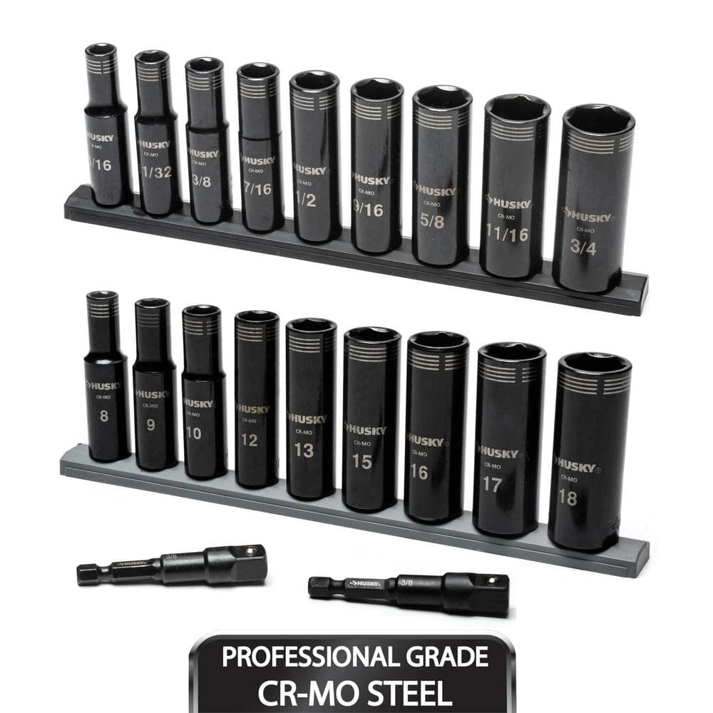 - Set includes: 9 thin wall SAE deep sockets: 5/16 in., 11/32 in., 3/8 in., 7/16 in., 1/2 in., 9/16 in., 5/8 in., 11/16 in., 3/4 in., metric deep sockets: 8 mm, 9 mm, 10 mm, 12 mm, 13 mm, 15 mm, 16 mm, 17 mm, 18 mm and (2) 1/4 in. hex x 3/8 in. drive adapter