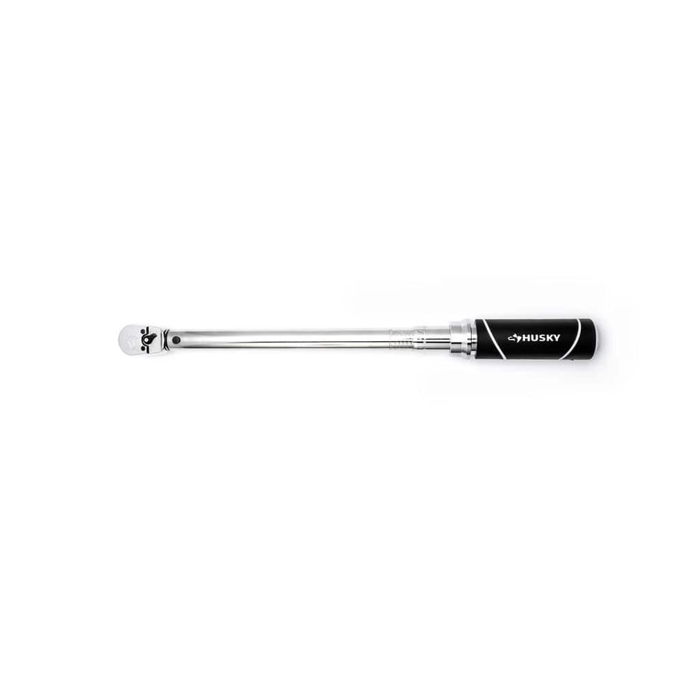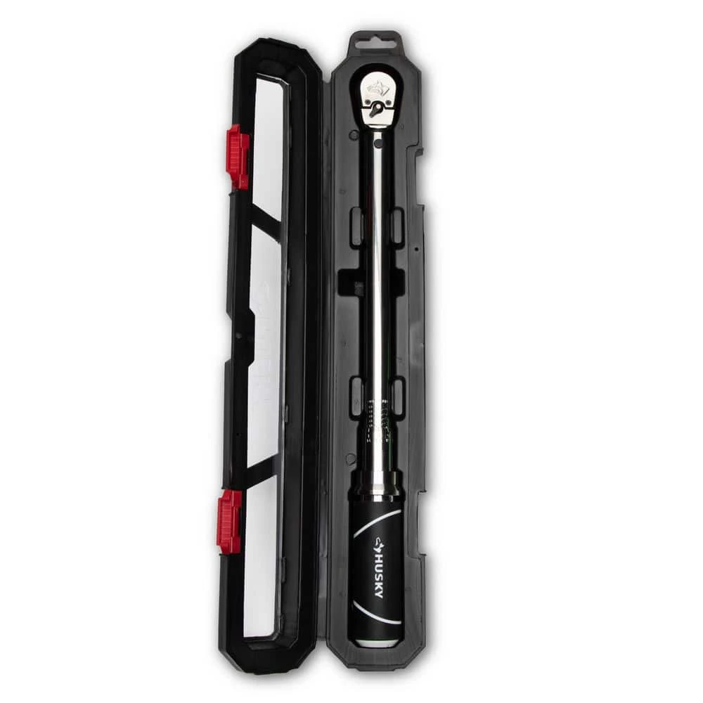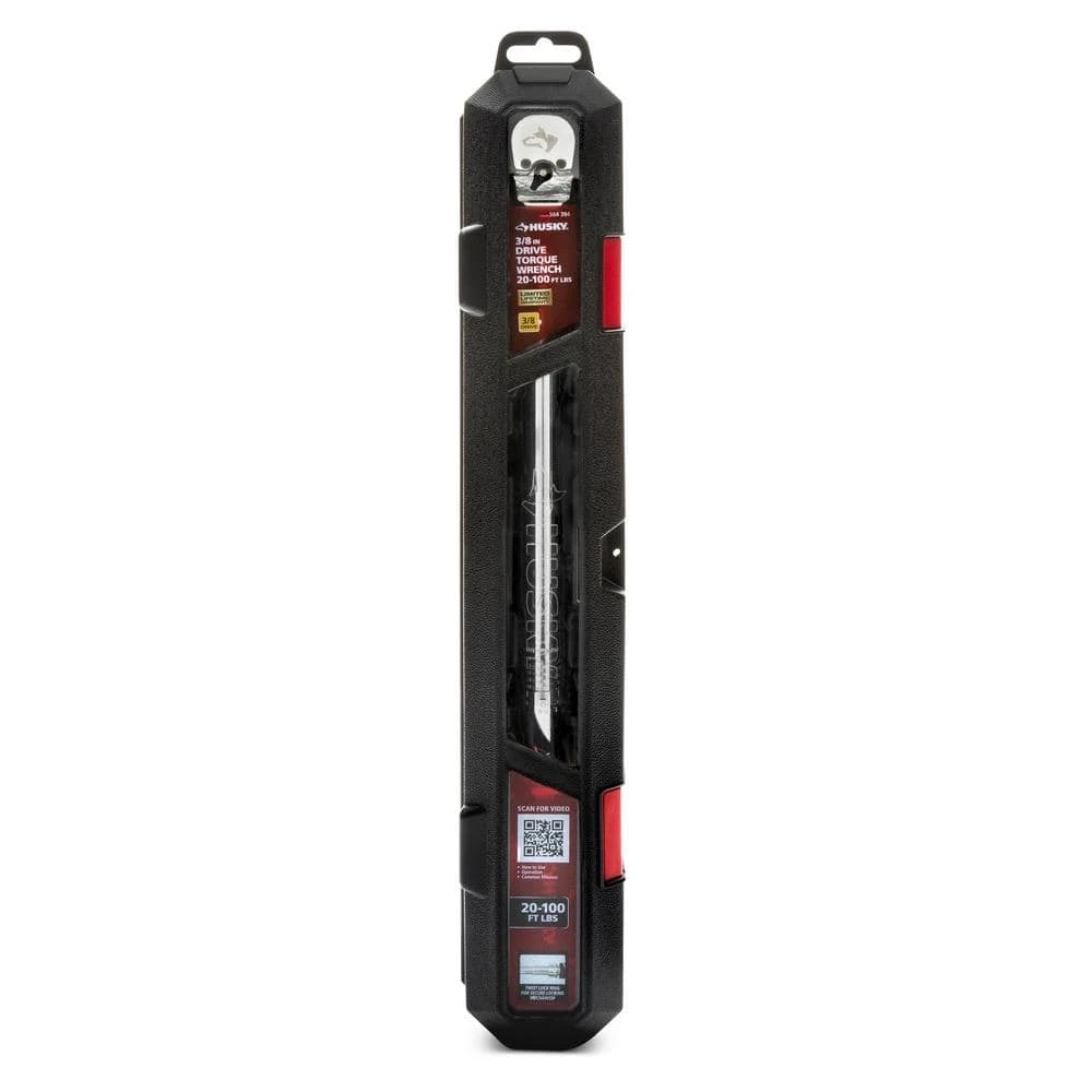 The Husky 3/8 in. Click Torque Wrench has a range of 20 ft./lbs. to 100 ft./lbs. and is made of alloy steel construction for strength and long-lasting performance. It also comes in a hard plastic storage case for safe-keeping when not in use. Its ergonomically designed handle easily turns to set torque. The finish provides resistance to corrosion and wipes clean easily. The Torque wrench features a torque accuracy of plus/minus 3% CW in the upper 80% of wrench capability and will give you an audible click when the desired torque setting is reached. Easy to use and effective in getting the job done accurately.