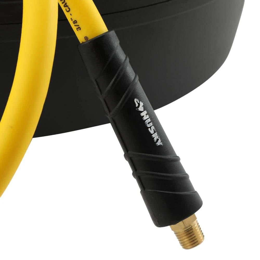 Husky Retractable Hybrid Air Hose is enclosed in a durable, crack-resistant case, making it great for anyone using pneumatic tools. It is highly flexible with cold weather tolerance. It has a maximum 300 psi and includes a wall-mountable bracket and retracts automatically.