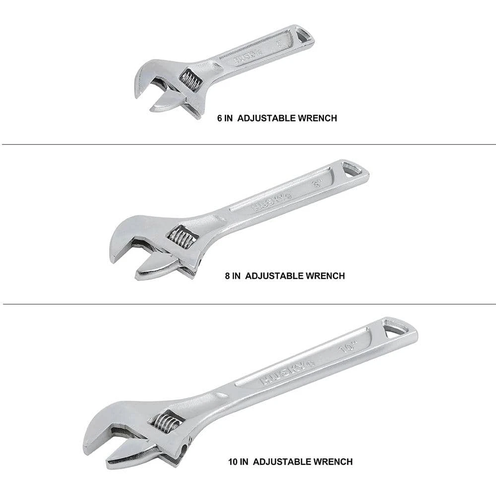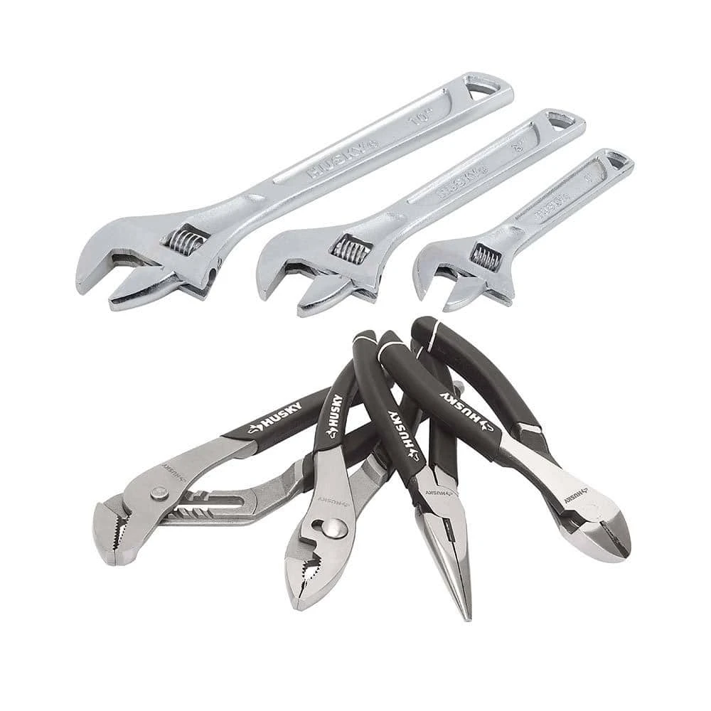 - Includes: one 6 in. adjustable wrench, one 8 in. adjustable wrench, one 10 in. adjustable wrench, one 7 in. diagonal pliers, one 8 in. long nose pliers, one 8 in. slip joint pliers, one 10 in. groove joint pliers