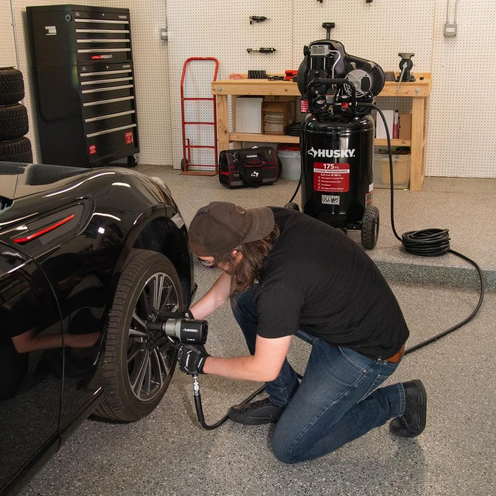 The Husky 30 Gal. oil lubed belt drive air compressor is industry leading with 2-stage performance in a single stage pump. This air compressor provides 54% faster recovery time compared to 30 Gal. 2 Stage compressors with 175 Max PSI. The heavy-duty, cast-iron, two-cylinder pump is oil lubricated for a long life and delivers 6.2 CFM at 90 PSI which provides 40% higher SCFM air delivery versus typical 30 gallon 2 Stage compressors with 175 PSI and 4.4 CFM at 90 PSI. At 76 dBA, the oil lubricated twin cylinder pump with cast iron construction is 71% quieter versus other 30 Gal. 2 Stage compressors with 175 Max PSI . The poly-v pulley & drive belt provides smooth operation of the air compressor with less vibration. In addition, the high efficiency aluminum flywheel is engineered to provide maximum air flow and allows for an efficient and smooth start-up. The Husky 30 Gal. 175 PSI air compressor is perfect for light automotive tasks, medium duty metal working and agricultural equipment repairs.