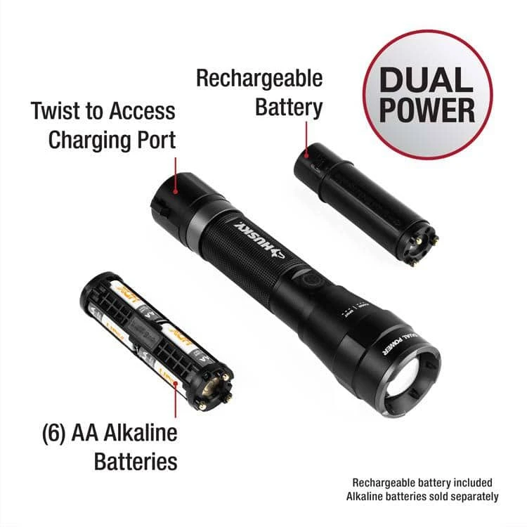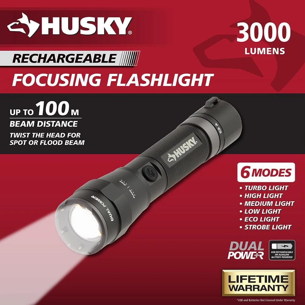 The Husky 3000 Lumen Dual-Power Rechargeable Flashlight is designed for exceptional brightness and versatility to illuminate small spaces and large areas. This multipurpose flashlight features advanced chip-on-board (COB) LED technology, 6-light modes, and twist focusing for a seamless transition between spot and flood light patterns. Dual-Power is a hybrid system that operates on either an included rechargeable lithium-ion battery or 6 AA disposable alkaline batteries (not included). Dual USB Type-C ports allow for fast input and output charging. The flashlight includes a 4000-lumen turbo mode, 80-hour ECO mode runtime, memory mode recall, USB power bank output, and a color-coded battery level indicator for easy power level monitoring. Crafted from durable aircraft-grade aluminum, it is impact-resistant, water-resistant with an IP54 rating, tested to ANSI/FL1 standards and backed by a Husky lifetime warranty, ensuring long-lasting reliability and excellent performance in any environment.