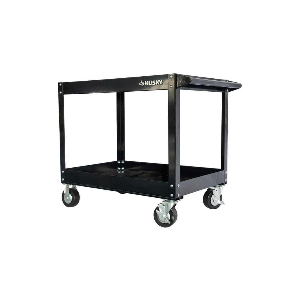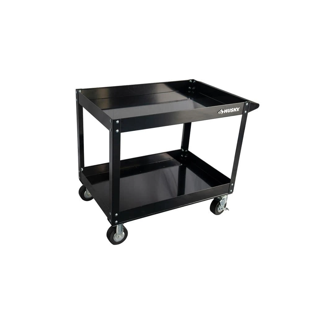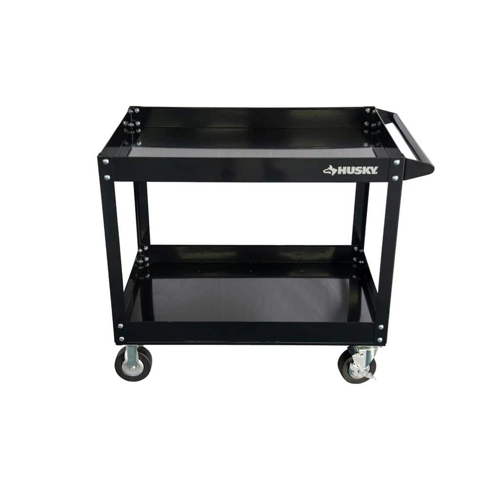 The Husky 36 in. 2 tier cart Mechanics Tool Cart is a utility cart that is essential in the shop, garage or even the office. The cart has 2 trays to hold a variety of tools. The top and bottom storage area is a perfect place to keep your commonly used items easily within reach. The larger, push-bar handle and heavy-duty, 5 in. x 2 in. casters allow this cart to be easily moved around your work area. With no clumsy washers and nuts to deal with, this tool cart can be assembled in minutes with the included bolts and pre-mounted threads.
