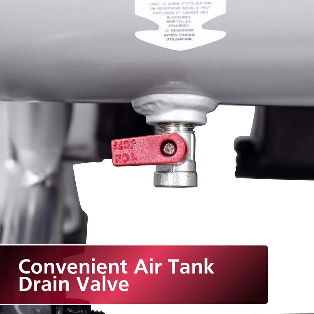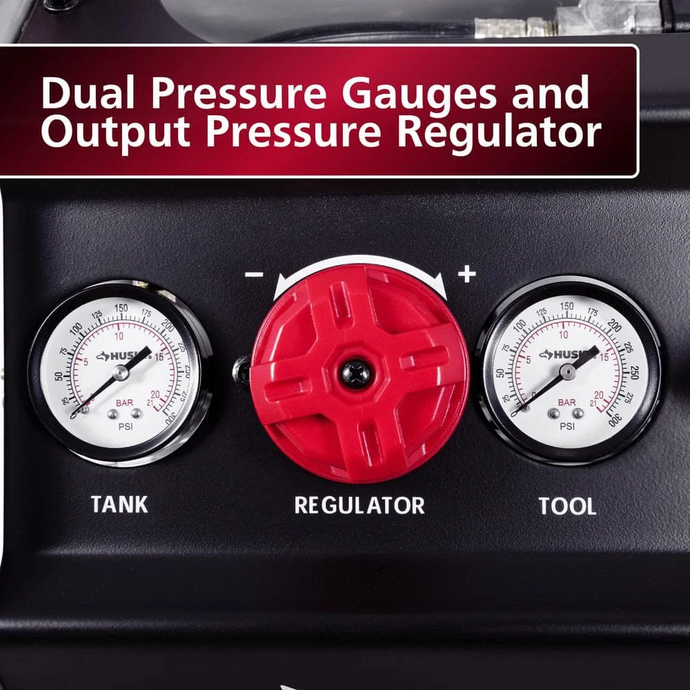 Do the work without the noise with the Husky 4.5 Gal. Portable Electric Air Compressor. This quiet compressor operates at less than 65 dBA, but delivers 3.0 SCFM at 90 PSI. Ideal for household inflation jobs such as bike tires, car tires, air mattresses, sports balls and pool toys. It’s also perfect for tools such as brad and finish nailers. A height adjustable handle and rubber wheels give this compressor easy mobility. Two quick couplers allow 2 tools to work simultaneously.
